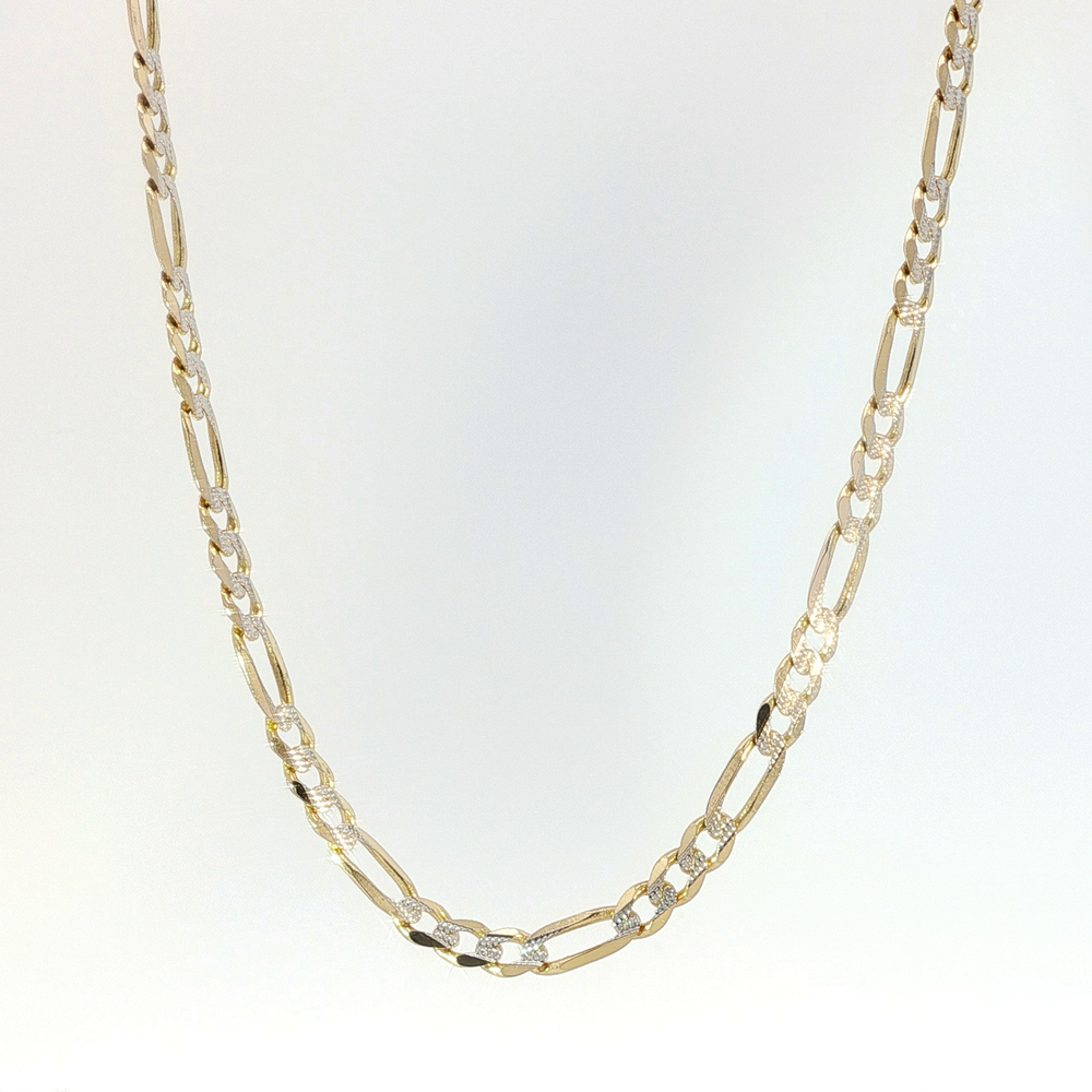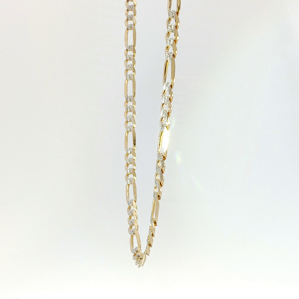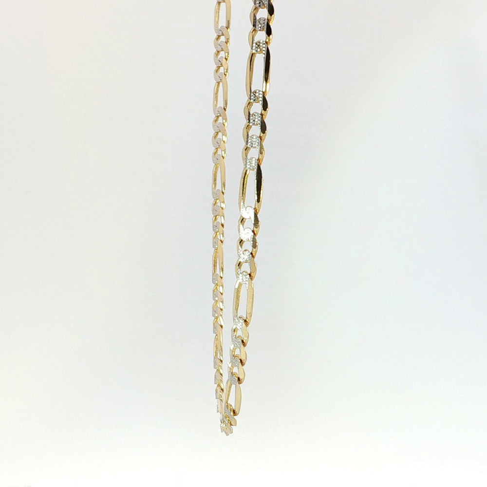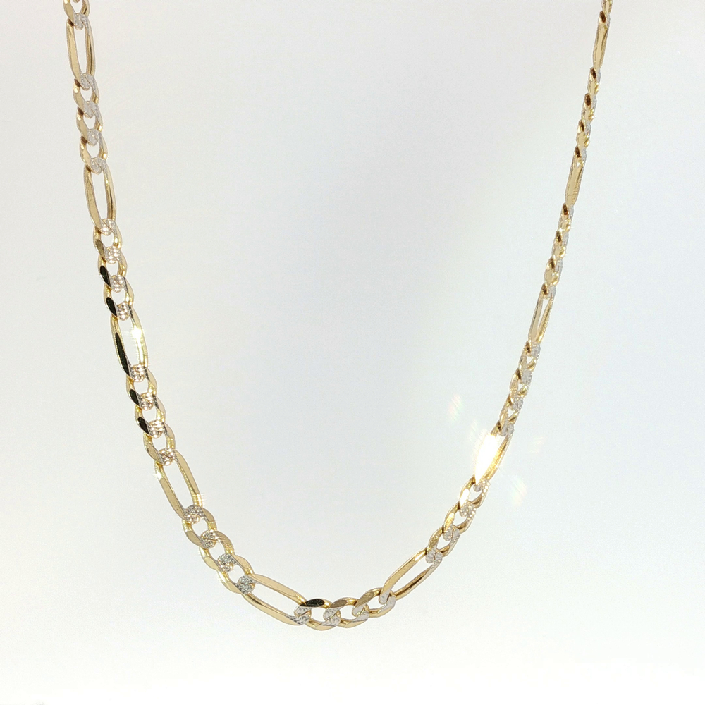 Stunning 24-inch long Figaro chain necklace intricately crafted from 14K two-tone white and yellow gold. The chain, with a width of 3.5mm, showcases an exceptional diamond cut finish for sophisticated sparkle. Weighing at 11.8 grams, this elegant piece is an excellent accessory for any event.