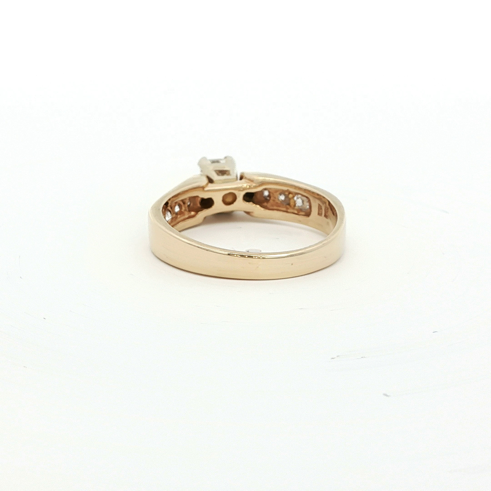 Experience the timeless elegance with this Ladies engagement ring featuring a 1/2ct total weight of diamonds featuring a 1/3ct radiant cut diamond center stone. This ring is set in 14k yellow gold. Size 6.5. This symbol of love offers a sophisticated charm to delight any woman's heart. A must have addition to her jewellery collection.