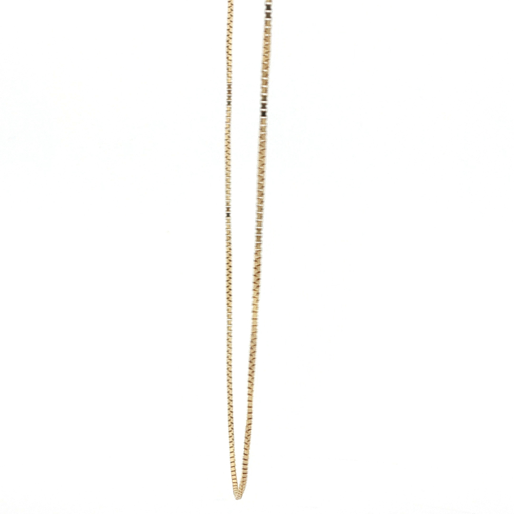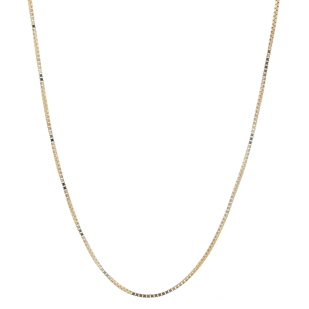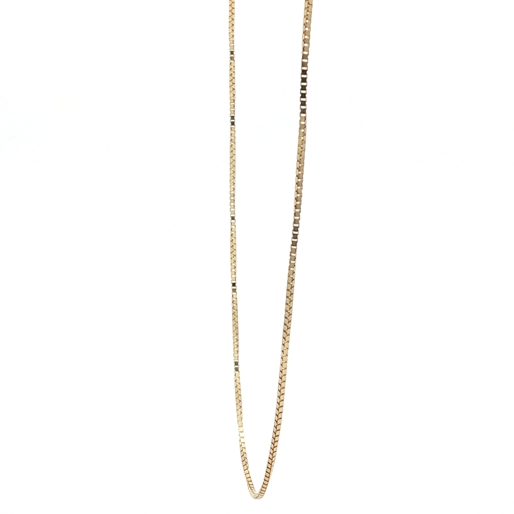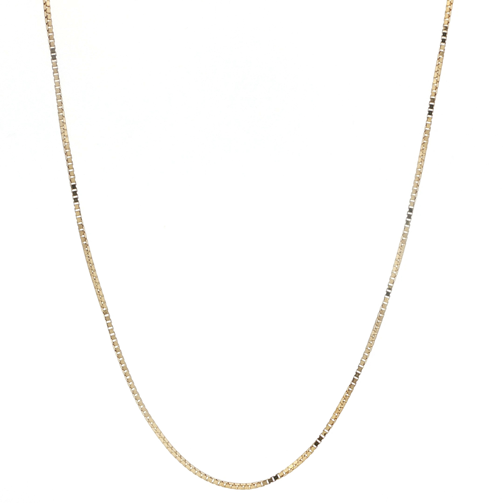 This sophisticated 14k yellow gold necklace is perfect for the stylish woman. The 18 inch box link design adds a modern touch to any outfit. Weighing 2.3 grams, it is lightweight yet durable. Exude elegance and luxury with this timeless jewelry piece.