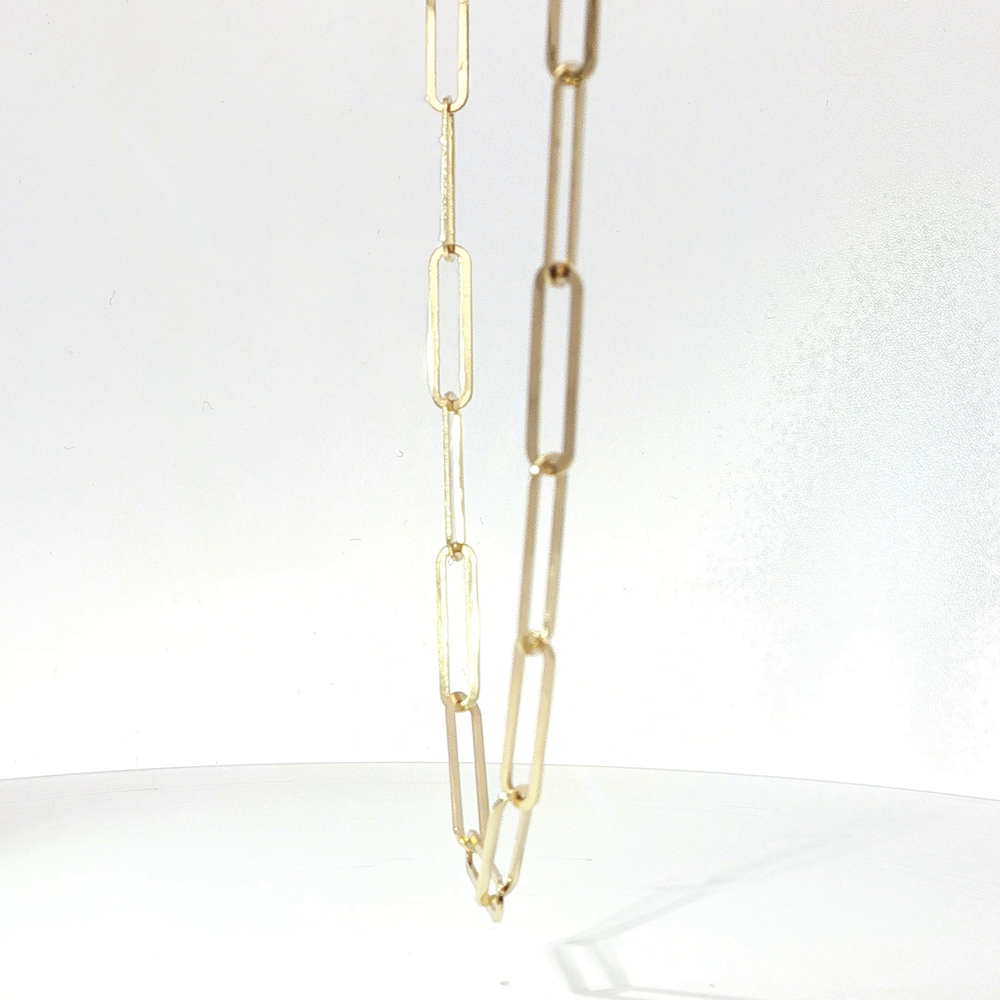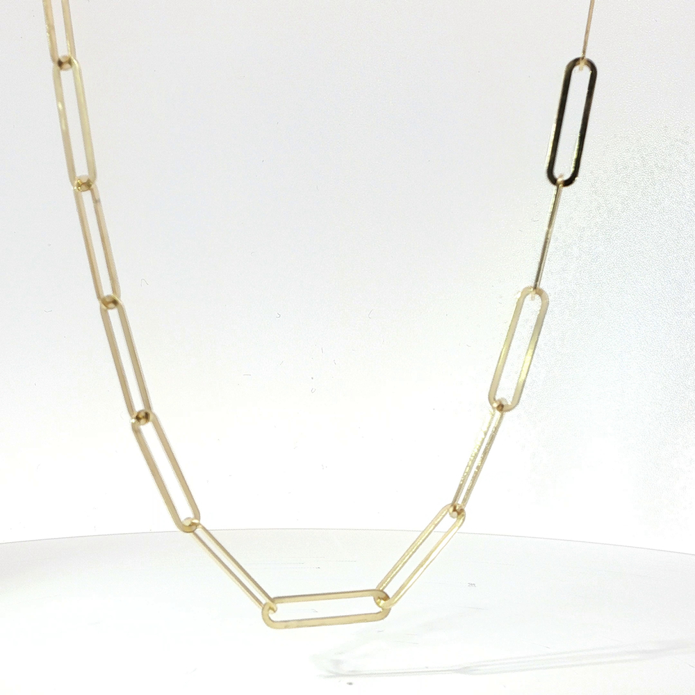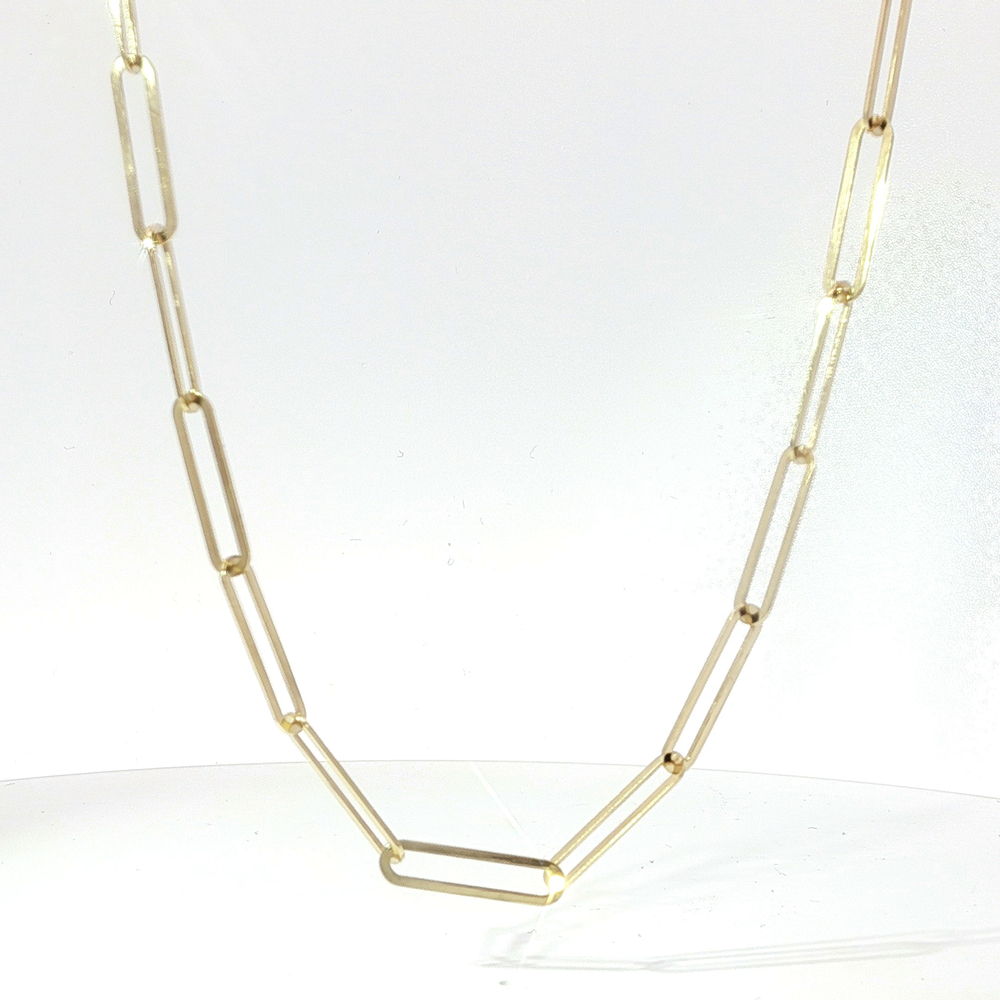 Experience the pinnacle of luxury with our precious 14k Yellow Gold 4mm Paper Clip Necklace. This exquisite, 18-inch ornament weighing 7 grams, effortlessly balances opulence with finesse. Its unique design resonates a chic charm that perfectly enhances a modern woman's elegance. An undeniable treasure to cherish forever.