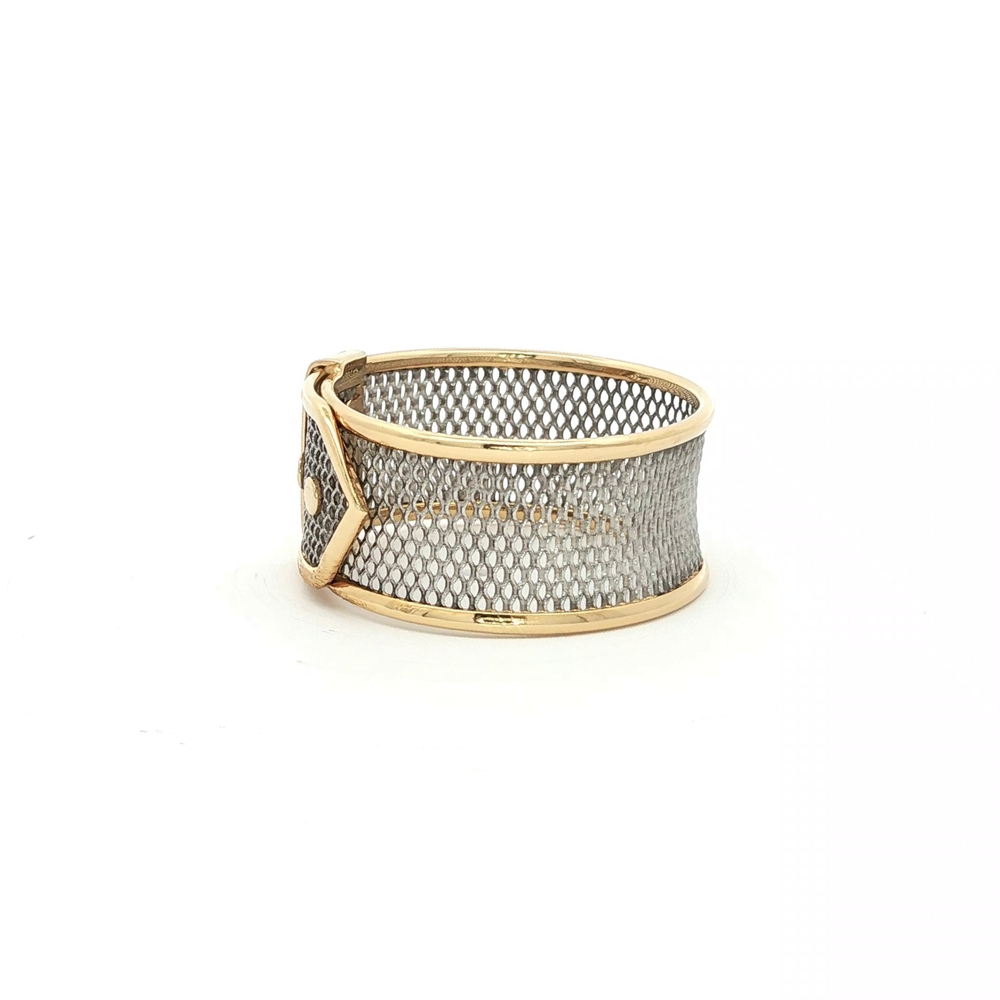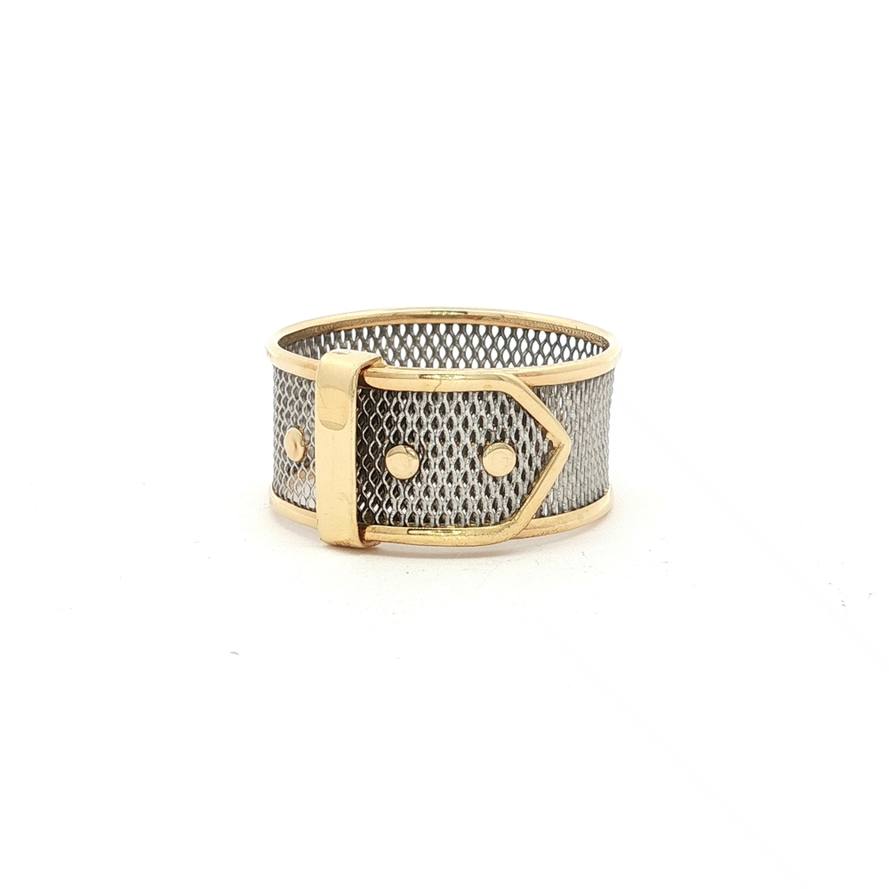 This beautiful belt ring, specifically designed for ladies, is crafted from high-quality 18k Two-tone White and Yellow Gold. With its 9.5mm size, it's an exquisite addition to any jewelry collection. This ring features a unique belt design, making it a piece that stands out. Wear elegance on your finger with this stunning piece.