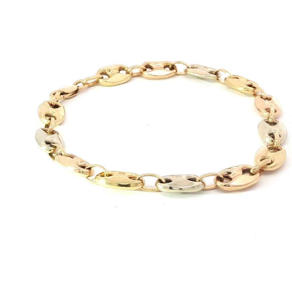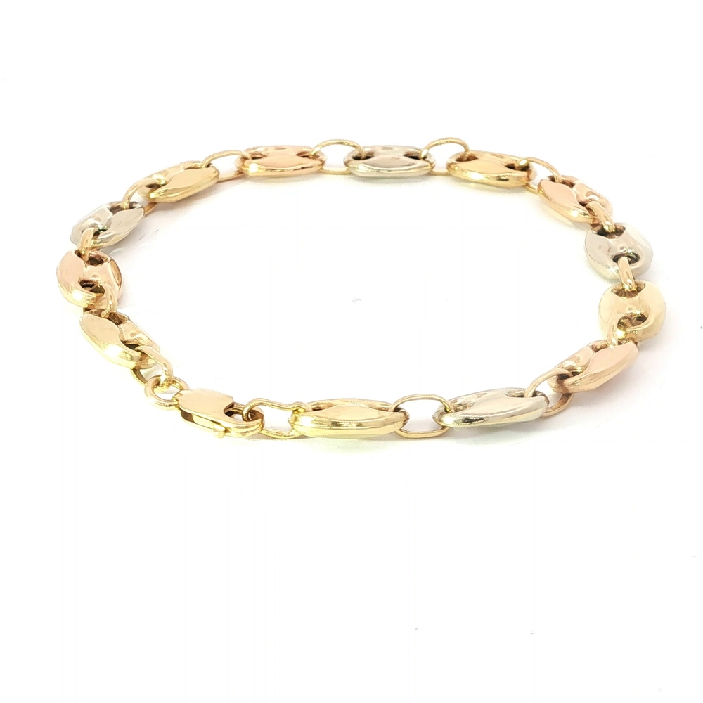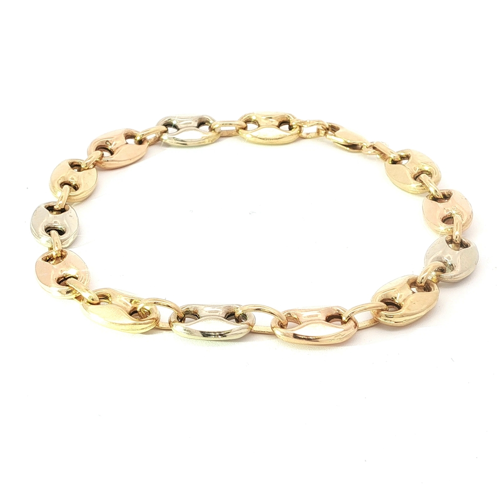 This stunning Ladies' 18k two-tone bracelet is a true statement piece. Exquisitely crafted in white and yellow gold, the bracelet is designed in the distinctive Gucci style. It measures 7 inches in length and has a weight of 8.1 grams, making it a luxurious and standout accessory.