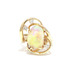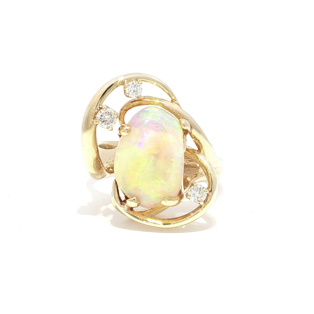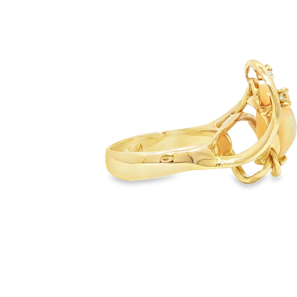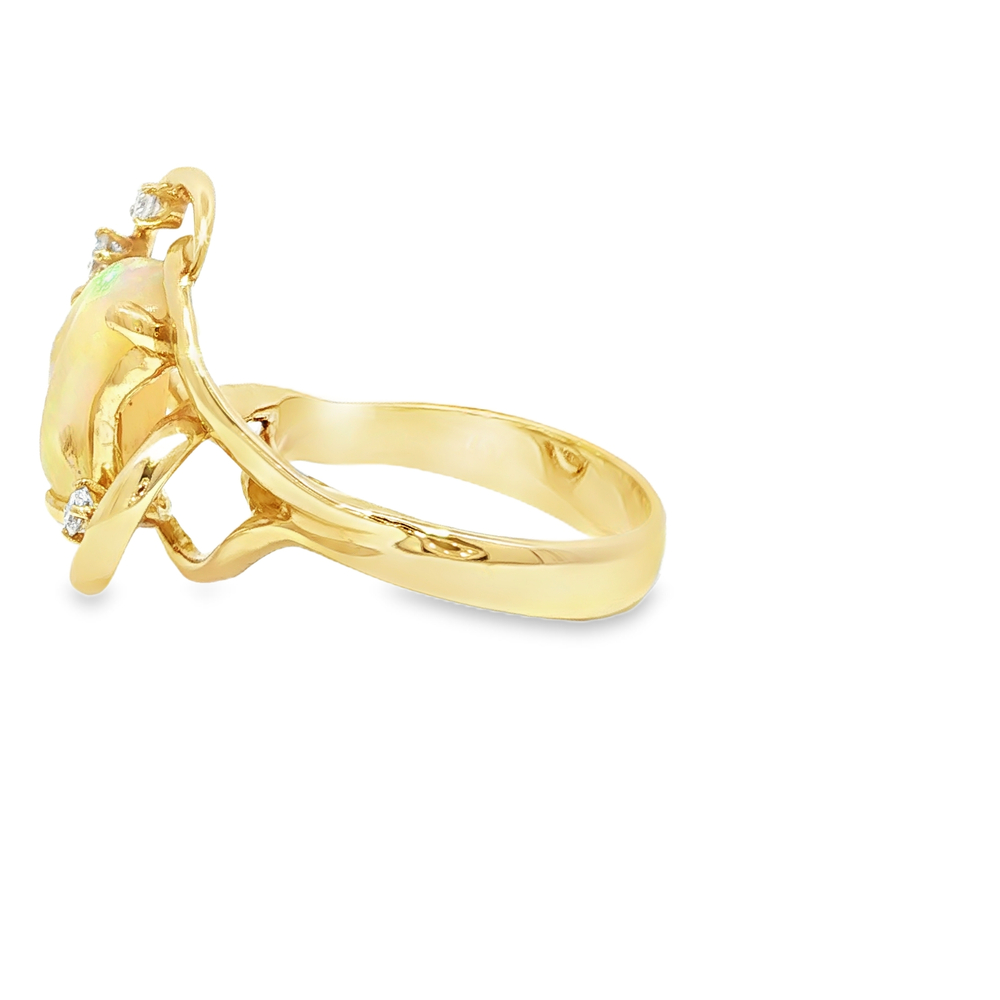 This exquisite ladies ring features a natural white opal accentuated with sparkling diamonds, all set in 14k yellow gold. A perfect birthstone ring, beautifully designed and sized at 8. It offers elegance, classic style, and a dash of luxuriousness to uplift any outfit.