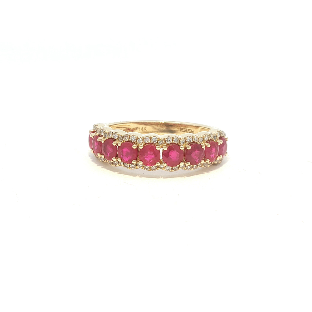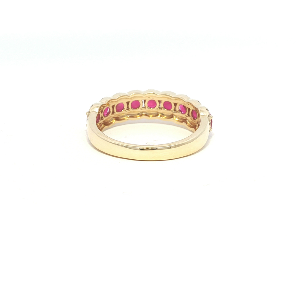 This exquisite ladies band ring, handcrafted in 14k yellow gold, delicately showcases vibrant rubies complemented by brilliant diamonds. With a ring size of 7, it offers a sophisticated blend of elegance and luxury. An heirloom-quality piece sure to enhance any personal jewelry collection.