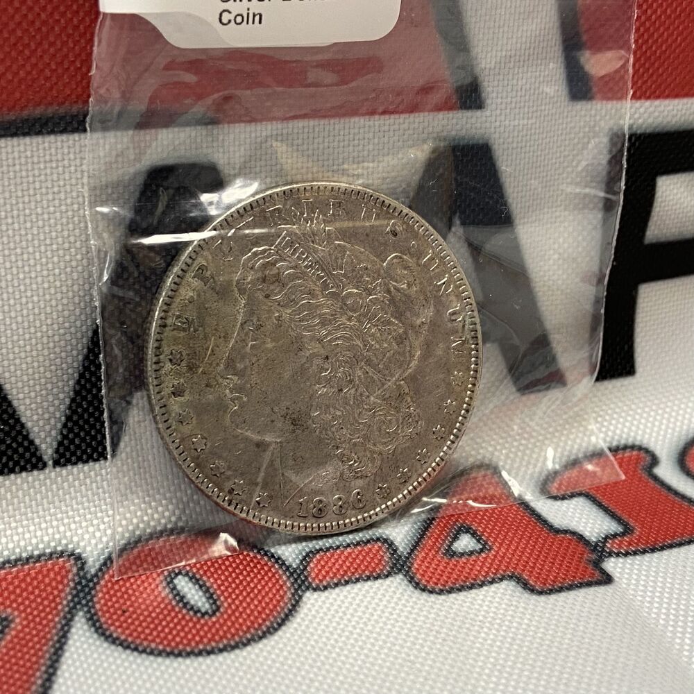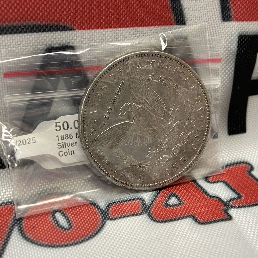 The 1886 Morgan Silver Dollar Coin is a sought-after collector's item made of 90% silver. Minted in the US, its obverse depicts Lady Liberty, while the reverse features a towering eagle. Boasts missing mint-mark, contributing to its rarity and value. Ideal for numismatists and investors alike.