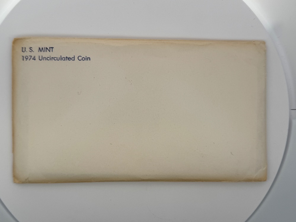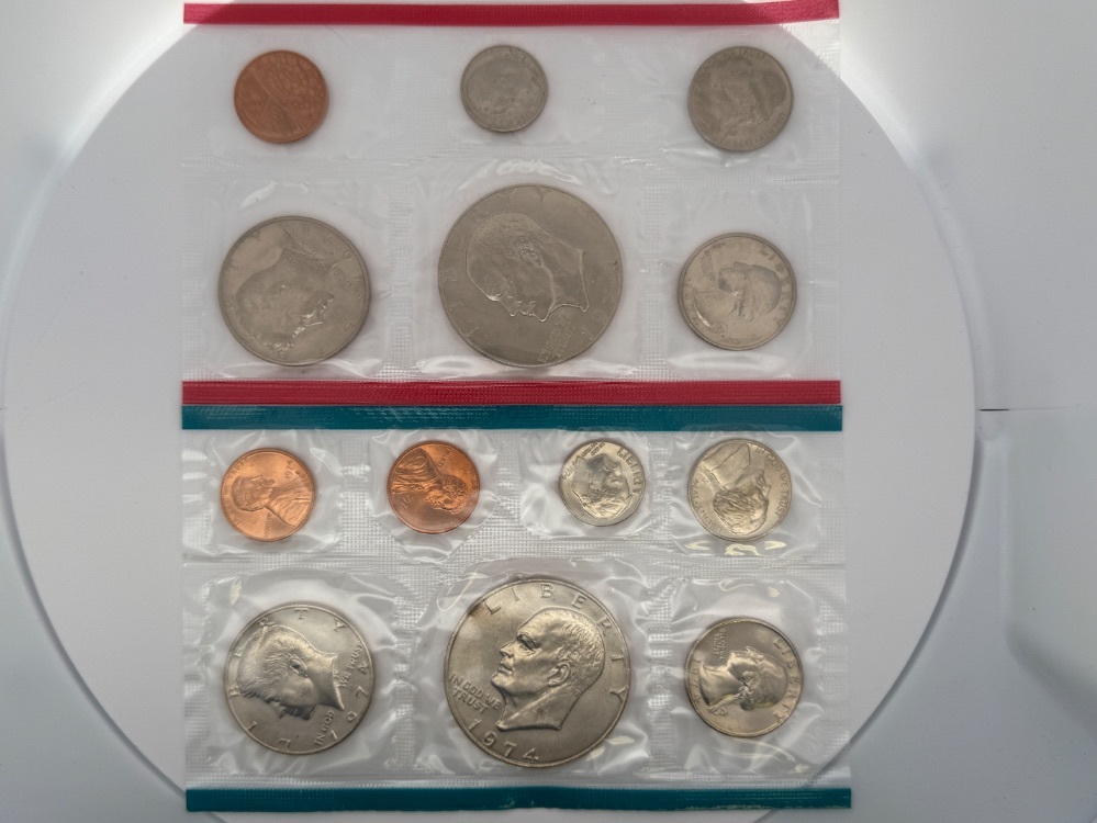 The 1974 US MINT Uncirculated Coin Set is a collection of American coins showcasing an array of denominations from the year 1974. The set includes both Philadelphia and Denver mint coins ranging from the Lincoln cent to the Eisenhower dollar. The set is ideal for collectors.