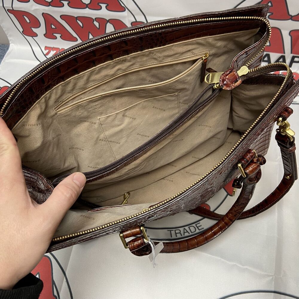 The Brahmin Finley Carryall N73 151 in Pecan is a high-quality, luxury handbag. Crafted from fine leather materials, the bag's versatile color blends well with any outfit. With a spacious interior, it can easily accommodate everyday essentials. Its elegant design brings a classy touch to your style. Limited stock available.