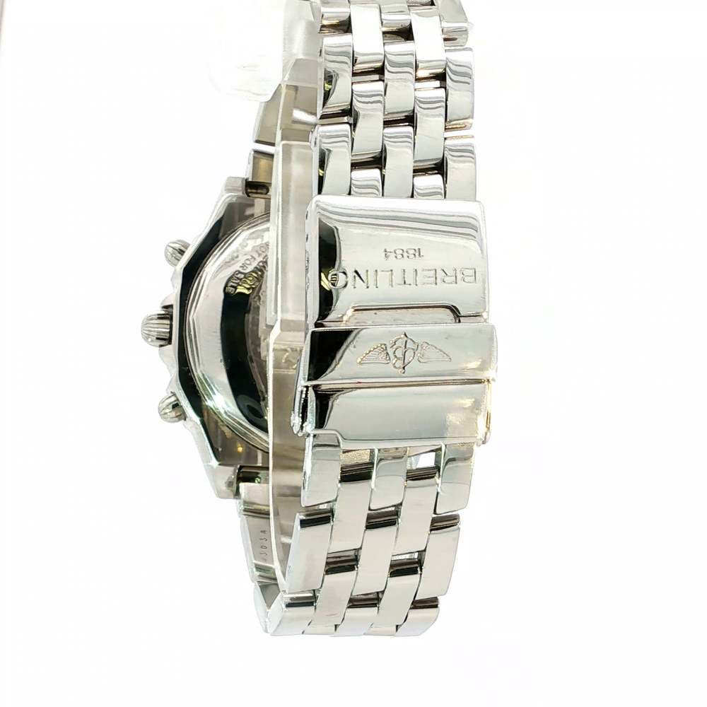 The Breitling Chronometre A13356 is a men's automatic chronograph watch. It features a robust 40mm stainless steel case, sleek black dial with multiple sub-dials, and luminous hands and markers. This luxurious timepiece offers precise timekeeping and a sophisticated, masculine style.