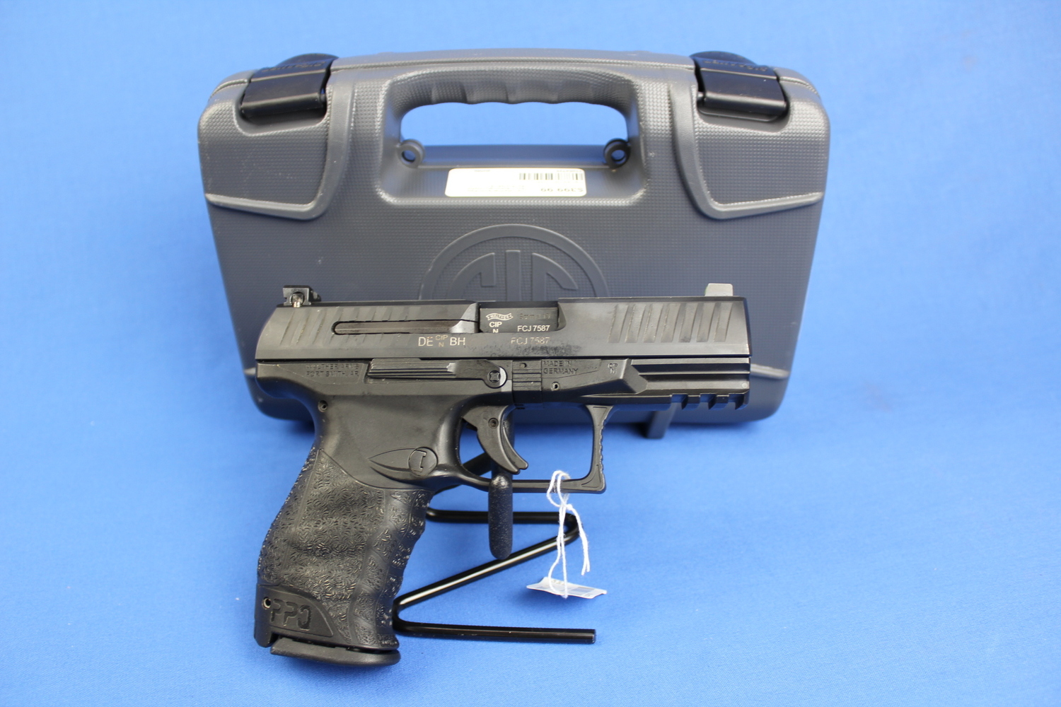 The Carl Walther 9mm PPQ Semi-Automatic Pistol, serial number FCJ7587, comes with a 4 barrel. This high-performance handgun offers smooth firing dynamics, short trigger travel, and optimum accuracy. It's known for its superior ergonomic design and quick-defense trigger system.