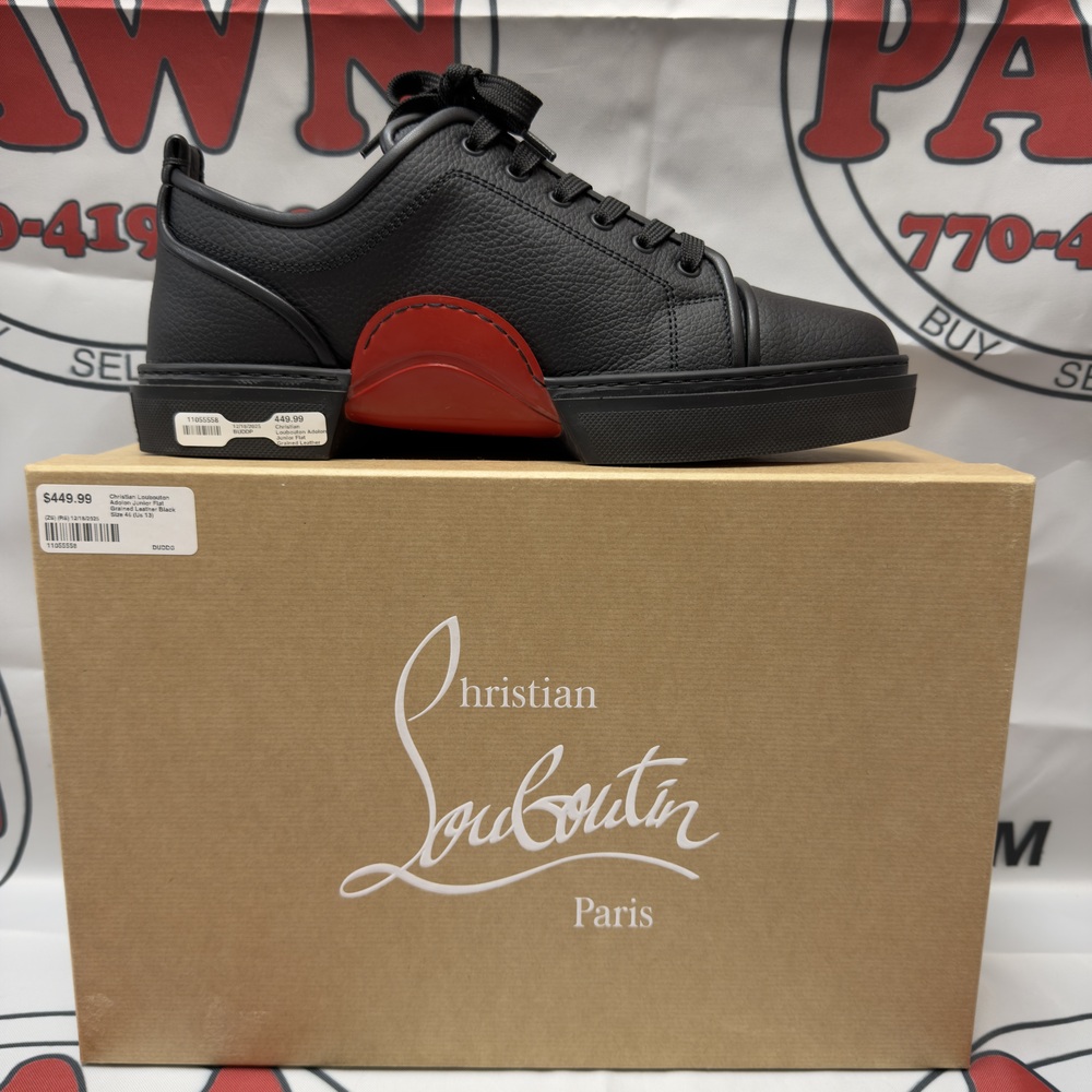 The Christian LouBouton Adolon Junior Flat Grained Leather shoes in size 46 (US 13) feature a classic black color. Crafted from quality grained leather, these sleek shoes exude elegance and durability. With their distinctive red sole, they effortlessly blend style and comfort for fashion-forward individuals.