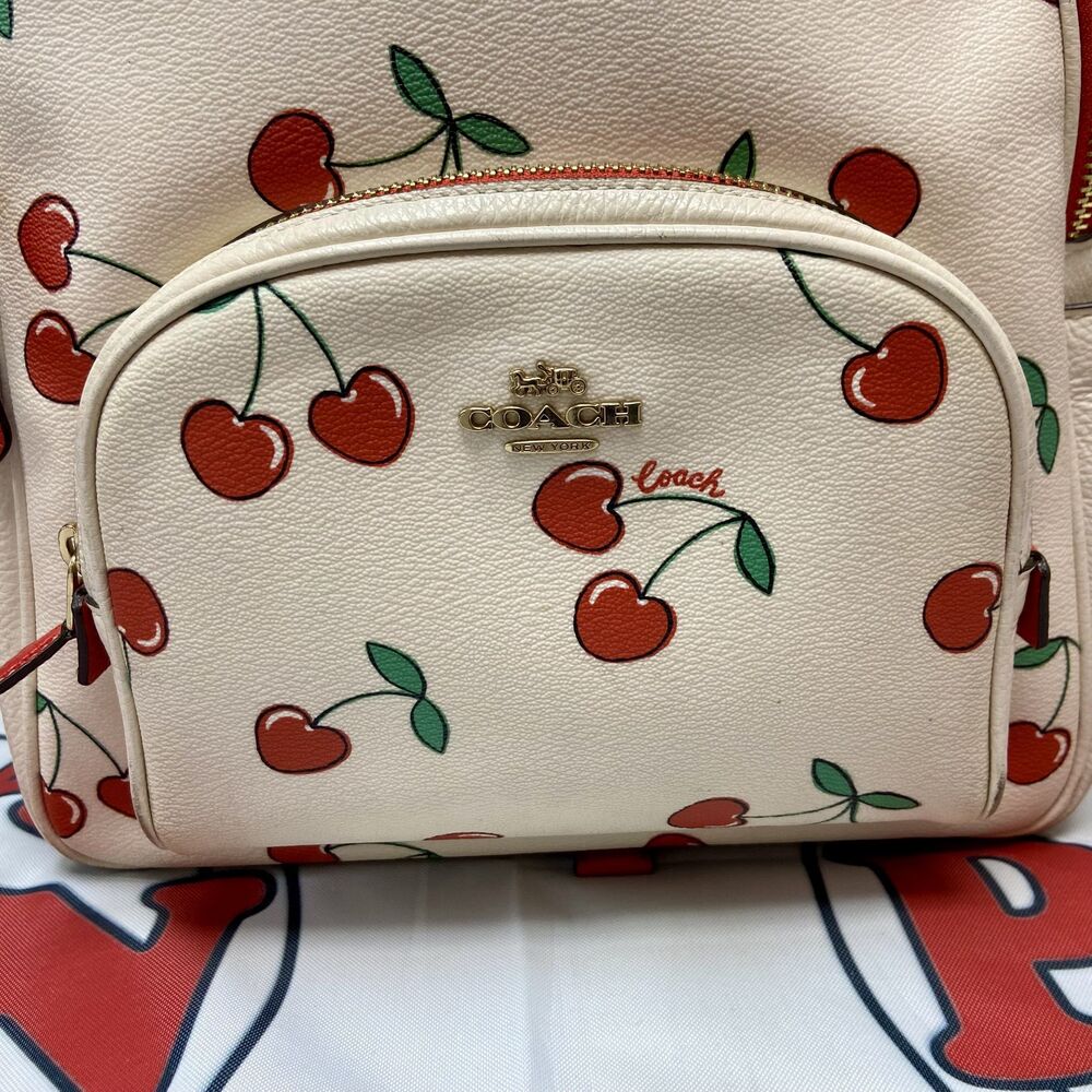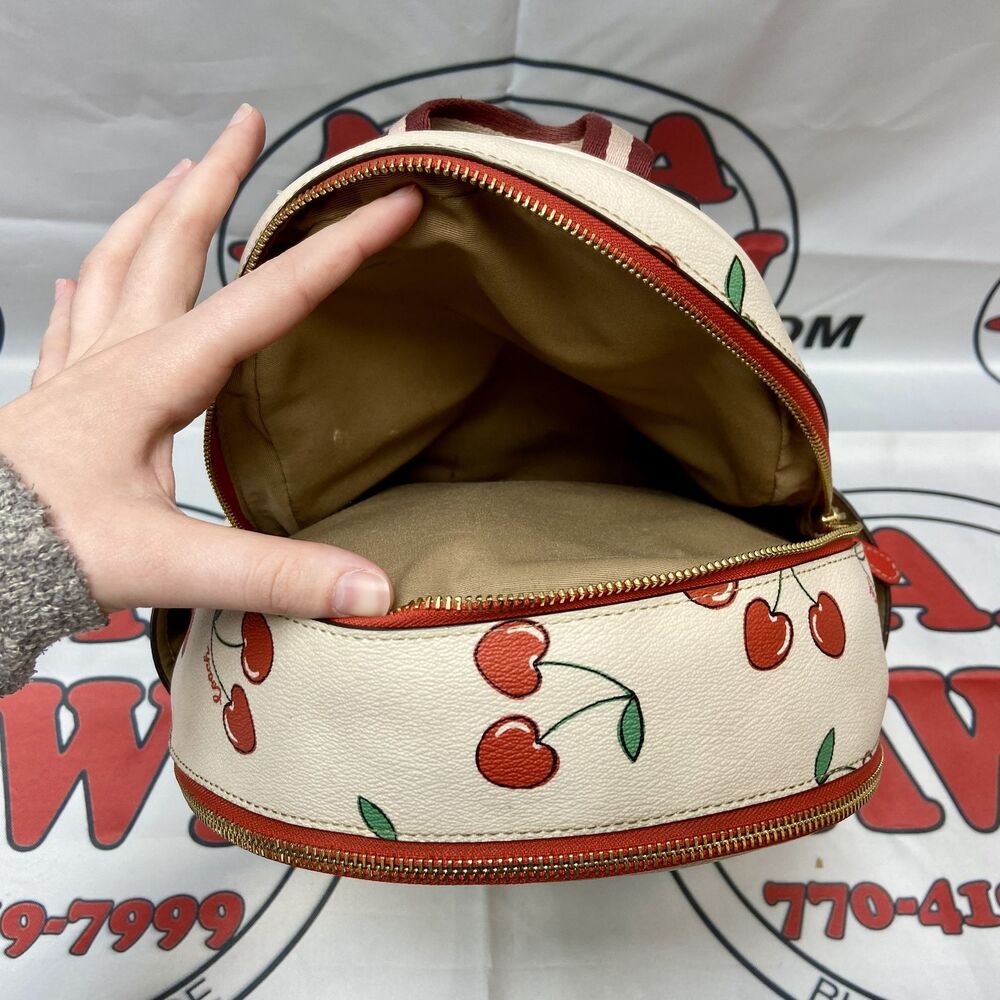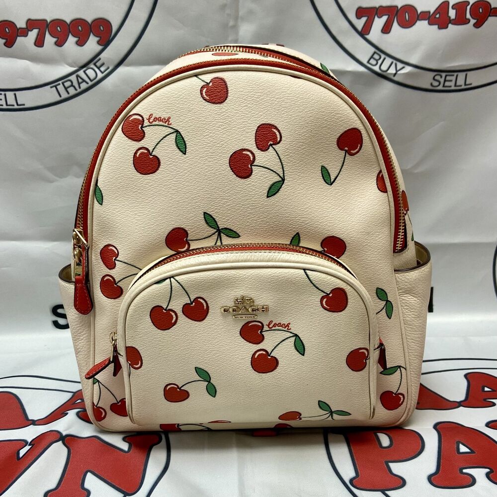 The Coach CE628 Women's Heart Cherry Print Court Backpack is a stylish and versatile piece in gold/chalk multi-color. Available in one size, it features a unique cherry print design, adding a playful yet chic touch. With ample compartments for storage, it's an excellent accessory for modern women.