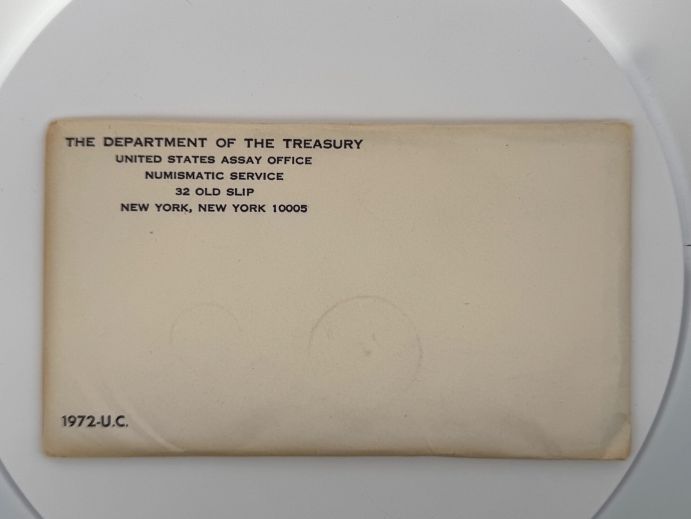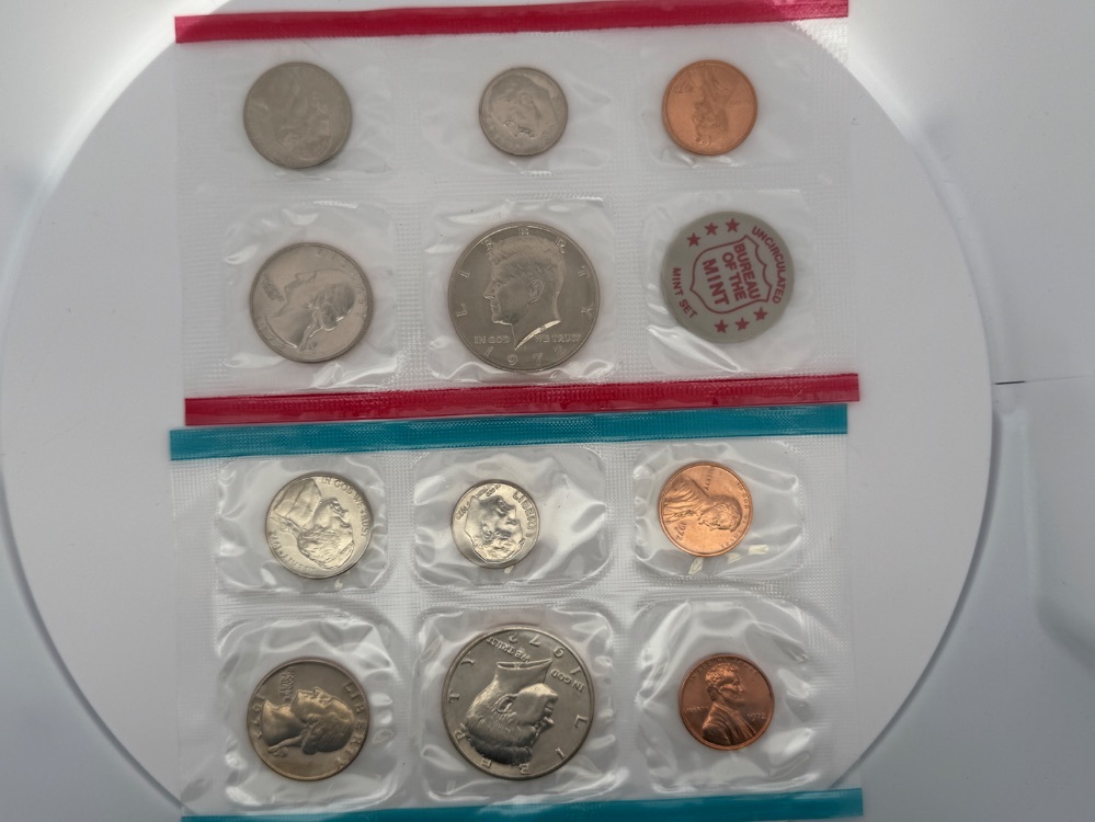 The Department of Treasury 1972 Uncirculated Coin Set comprises pristine coins including denominations of pennies, nickels, dimes, quarters, half dollars, and dollars. These coins, free from wear-and-tear, were produced by the United States Mint, encapsulating a key annual snapshot of American numismatic history.
