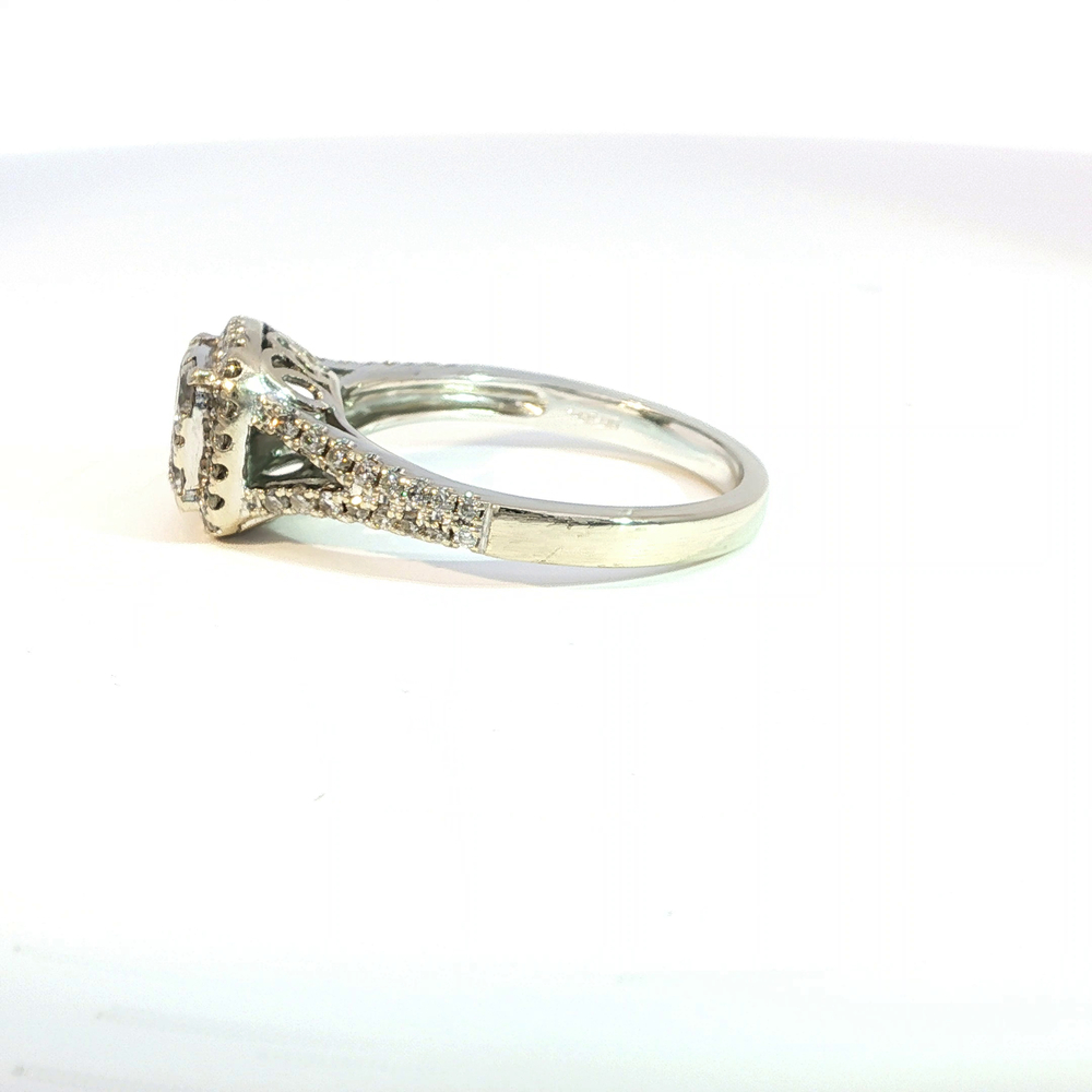 Presenting a stunning ladies engagement ring, crafted from 14k white gold. This size 8 ring features a 1ctw diamond, encircled by a glistening diamond halo for added radiance. It merges sophistication with timeless appeal, making it a perfect symbol of everlasting love. This ring comes with a jewelry Evaluation Report from International Gemological Institute so you can buy with confidence.