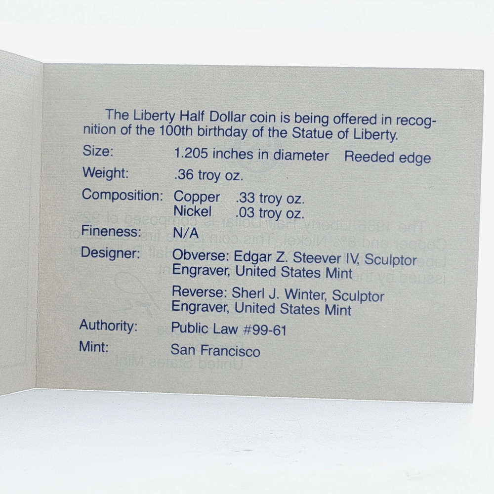 Liberty Half Dollar 100th Birthday of the Statue of Liberty Proof Coin w/ Certificate of Authenticity