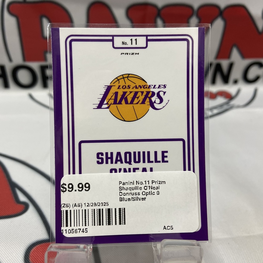 The Panini no.11 Prizm Shaquille O'Neal Donruss Optic Blue/Silver is a limited edition basketball card. Featuring NBA legend, O'Neal, the card is enhanced with prismatic and 'optic' aesthetics; its value lies in its exclusivity, with only 50 units globally. Imbued with a dual colour of blue and silver, it's a collector's holy grail.