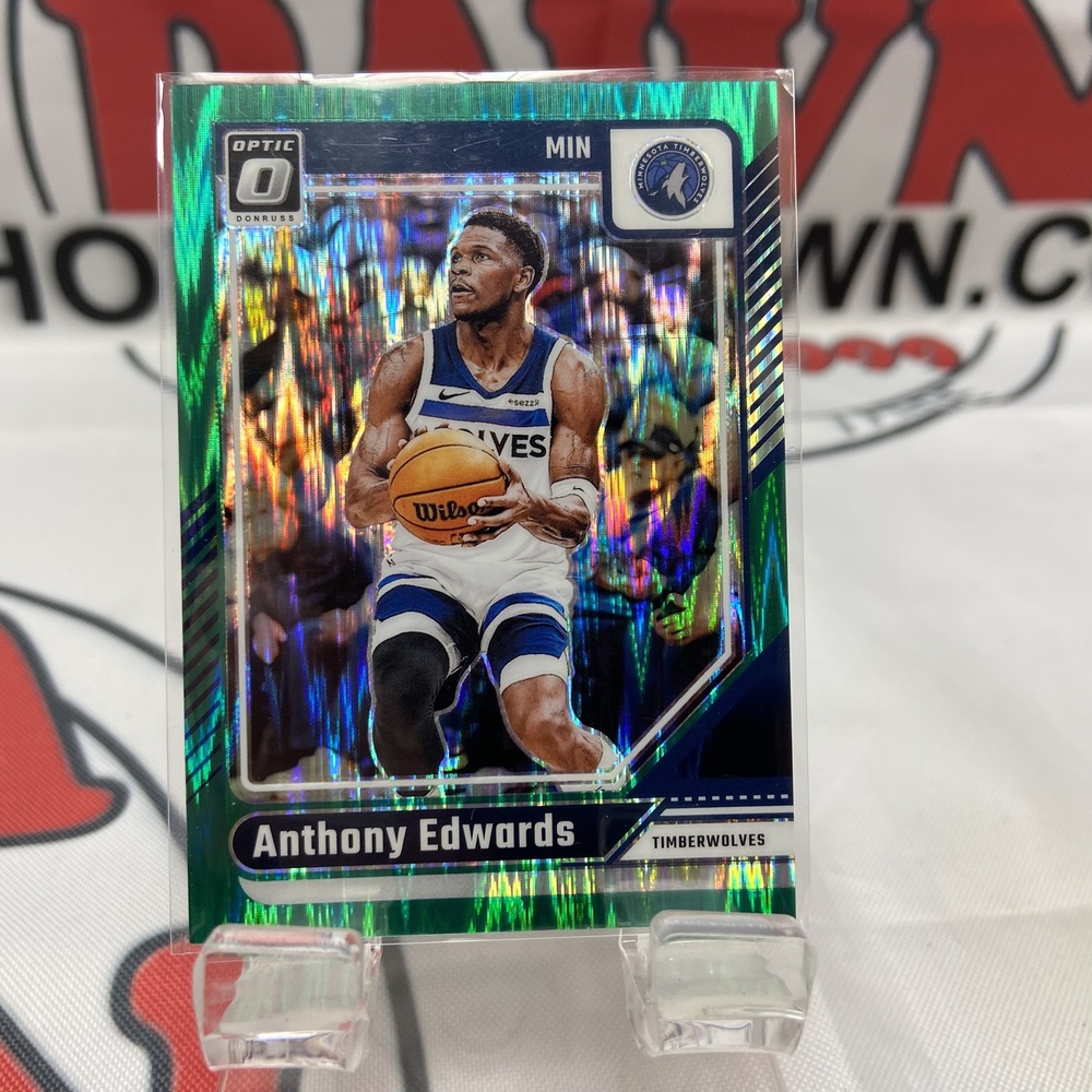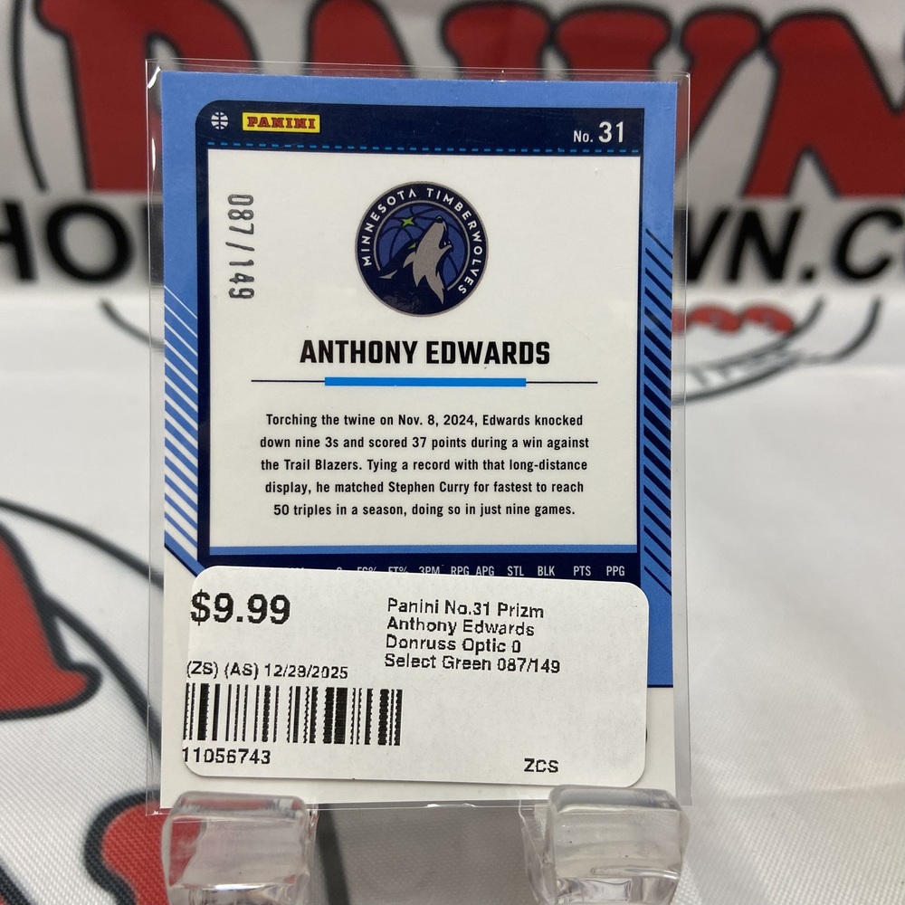 The Panini Prizm number 31 features NBA star, Anthony Edwards. It's from the premium Donruss Optic collection and comes in a striking Select Green design, boasting a unique serial number of 087/149. The exclusive, limited-edition item is highly sought after among collectors.