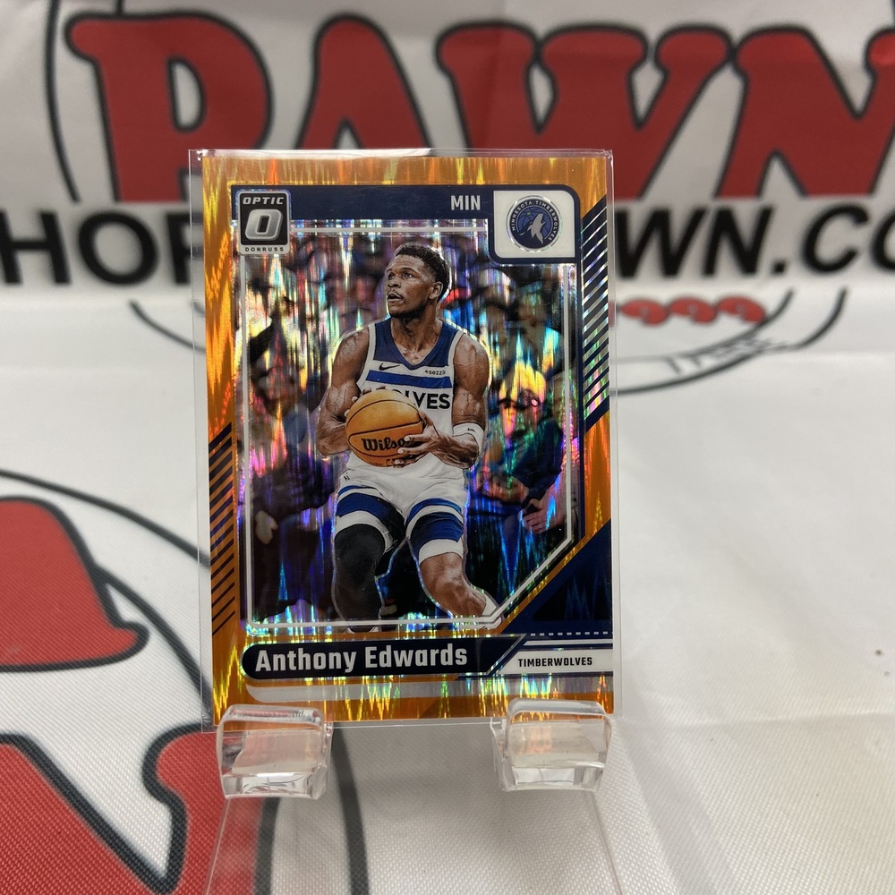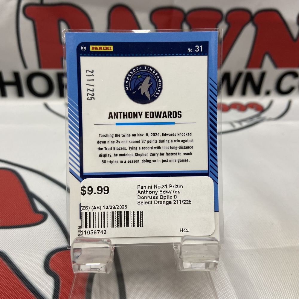 Panini no. 31 is a gem for basketball card collectors, featuring the promising rookie, Anthony Edwards. This Prizm edition is from the Donruss Optic range and particularly rare being one of 225 orange select series. Its rarity and Edwards' rising popularity make this card a worthy addition to any collection.