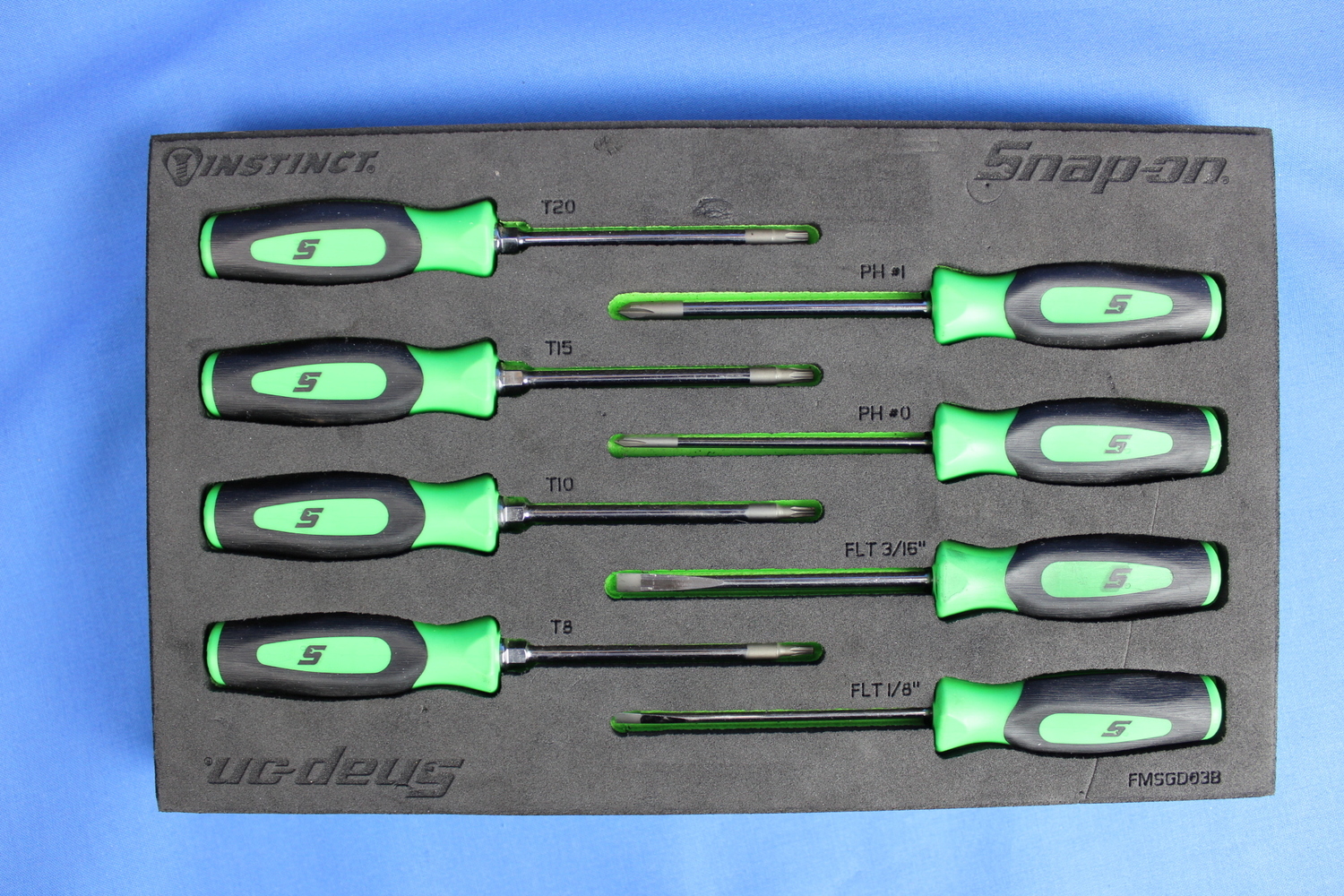 This Snap-On Tools Instinct Mini Screwdriver/Torx Set (FMSGD03B) in foam includes various sizes for different tasks. The set, housed in a green foam, ensures organization and easy access. Known for durability, this tool set ensures high-performance results from the robust driver heads to the comfortable grip handles.