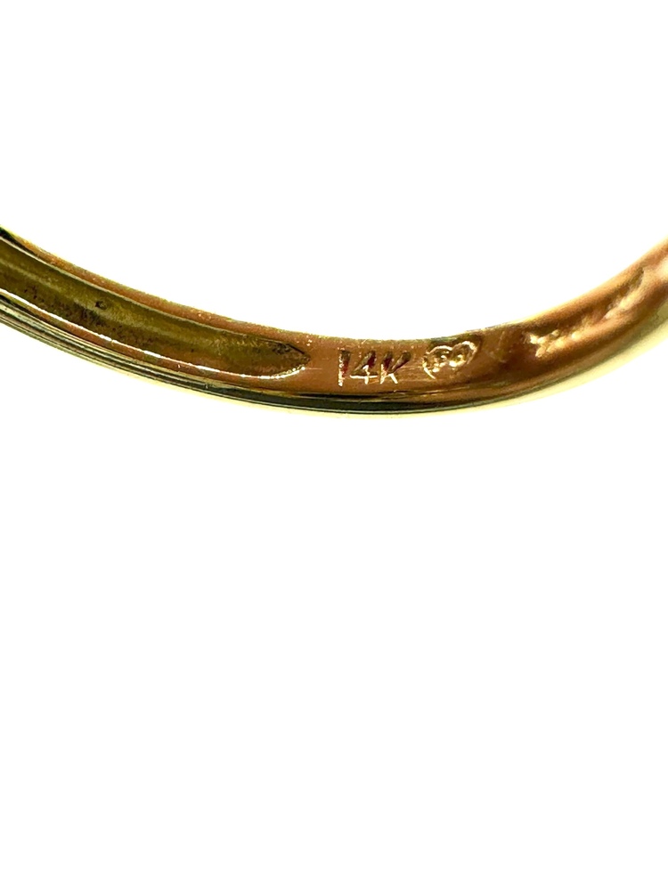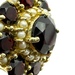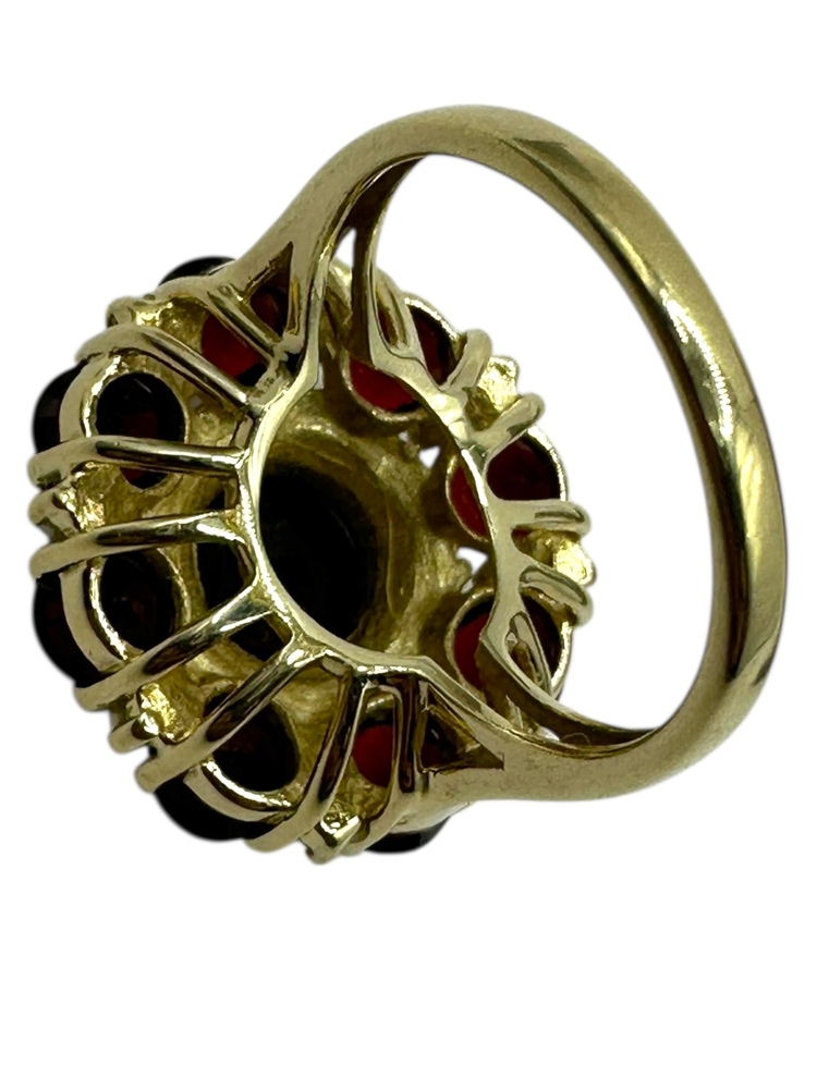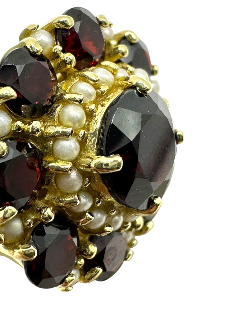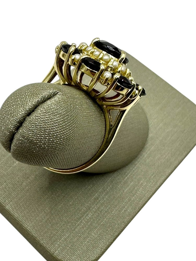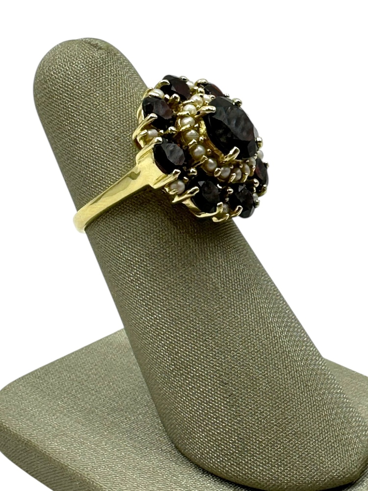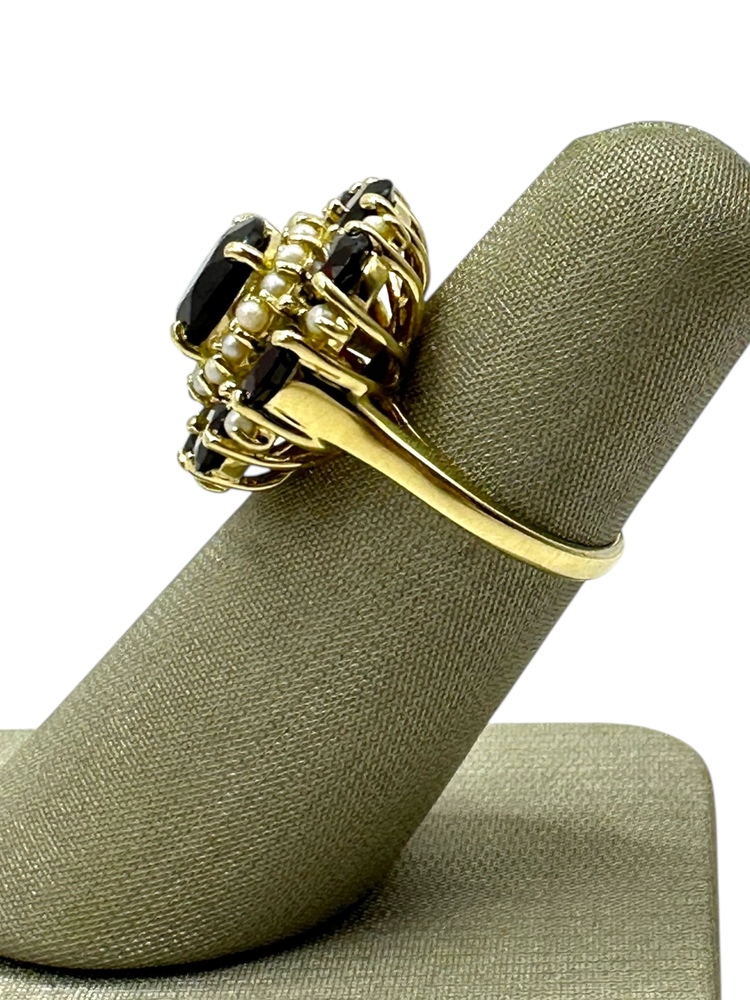 14K Yellow Gold Red Stone & Seed Pearl Round Halo Ring