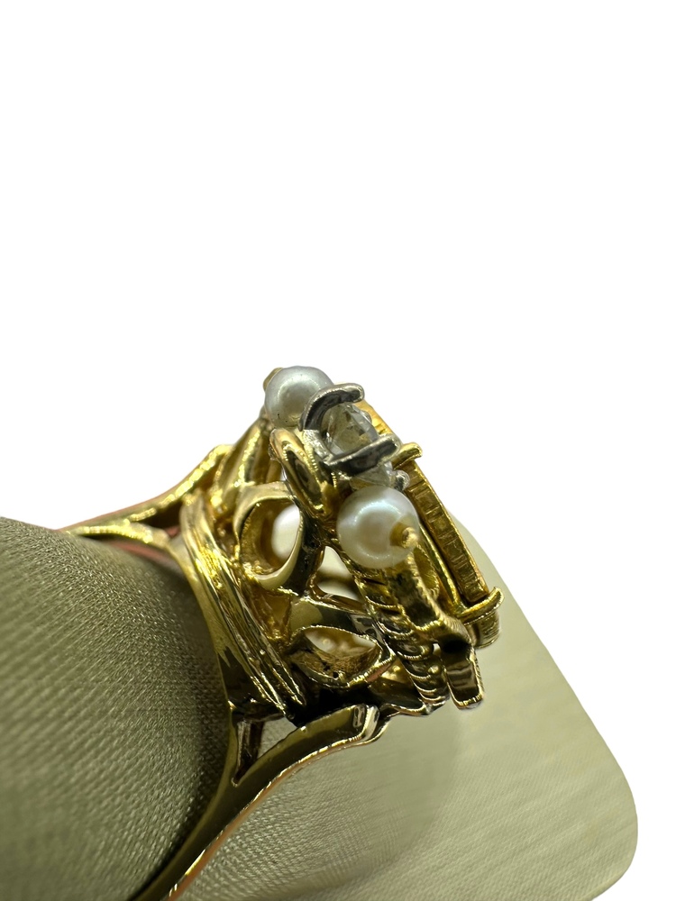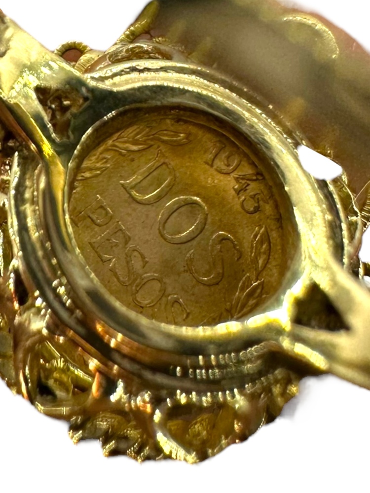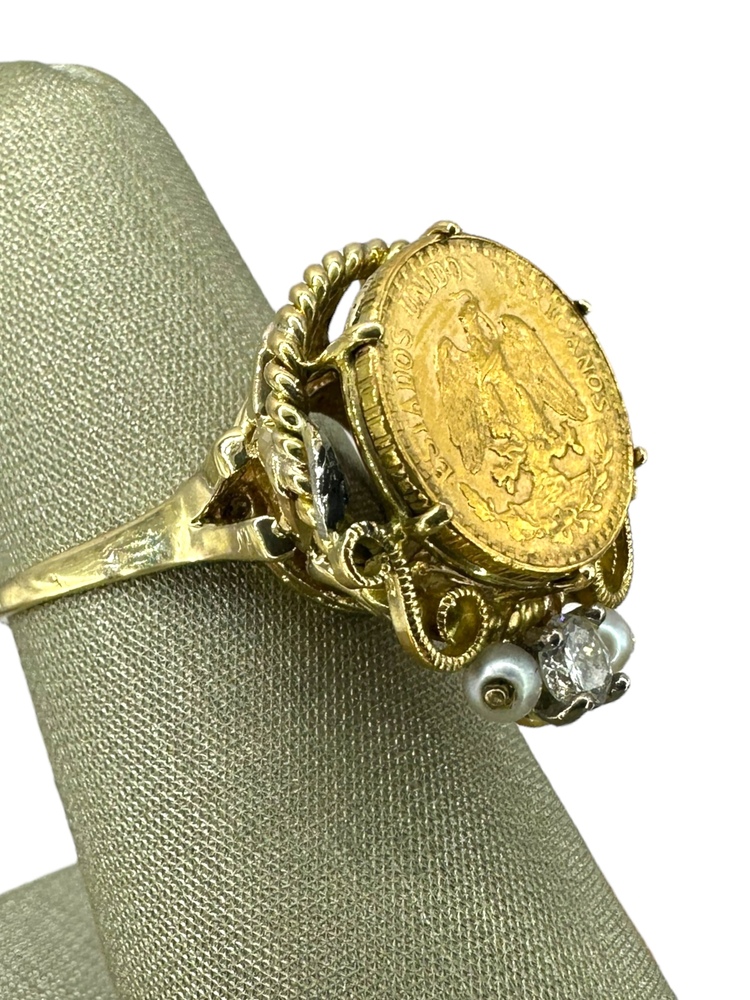 14K Yellow Gold Ring with Dos Peso Gold Coin, Diamond & Pearls