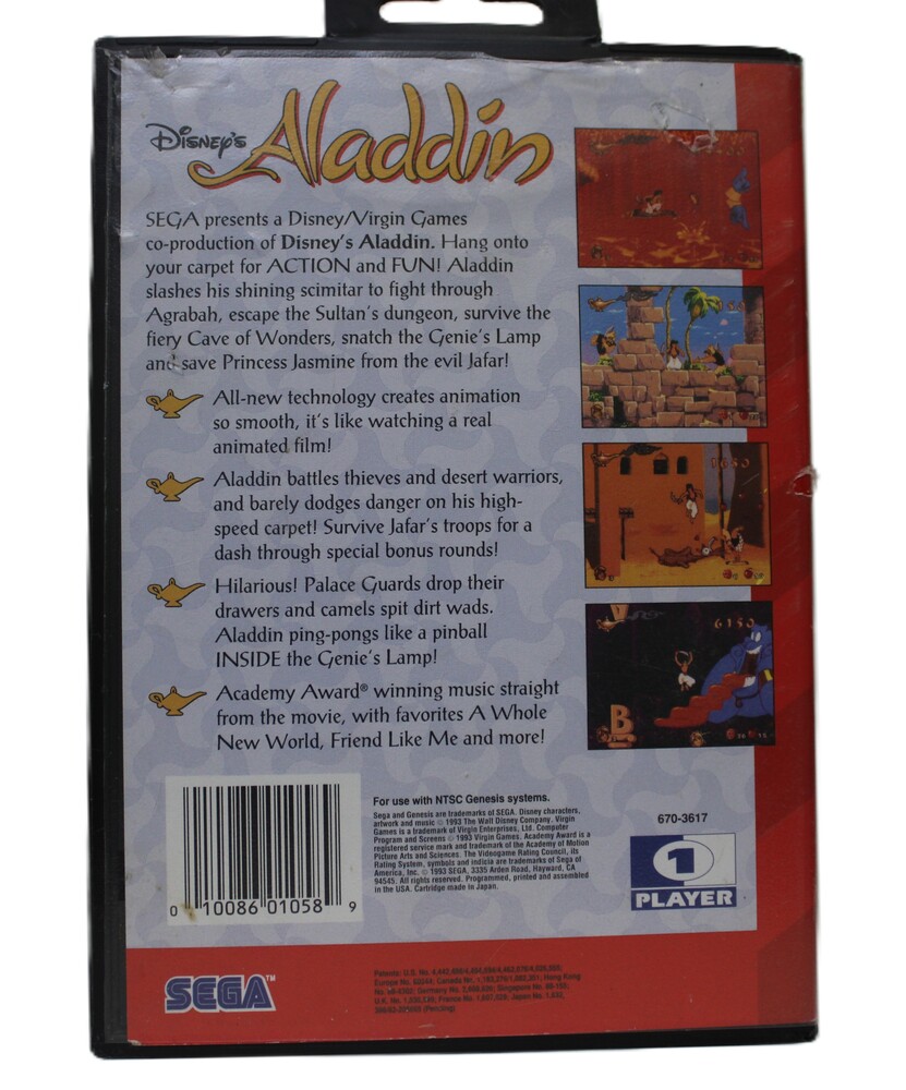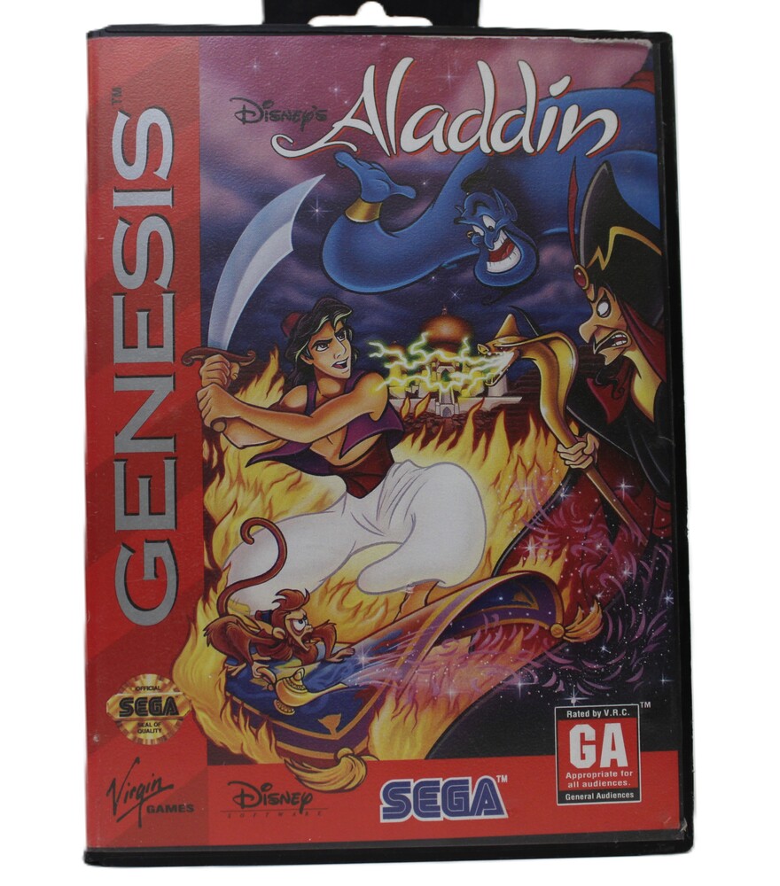 Disney's Aladdin for Sega Genesis, released in 1993, is a platform game where players control Aladdin through various levels based on movie scenes. It features action, puzzle-solving, and memorable music, with praised detailed animation. It's one of the best-selling Sega Genesis games.