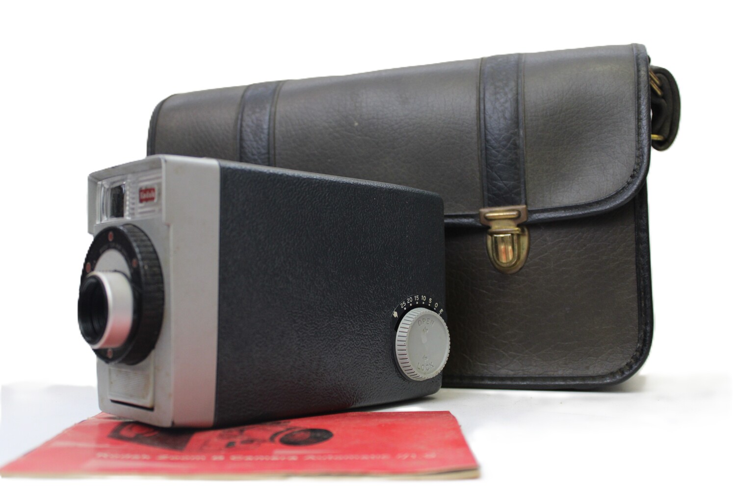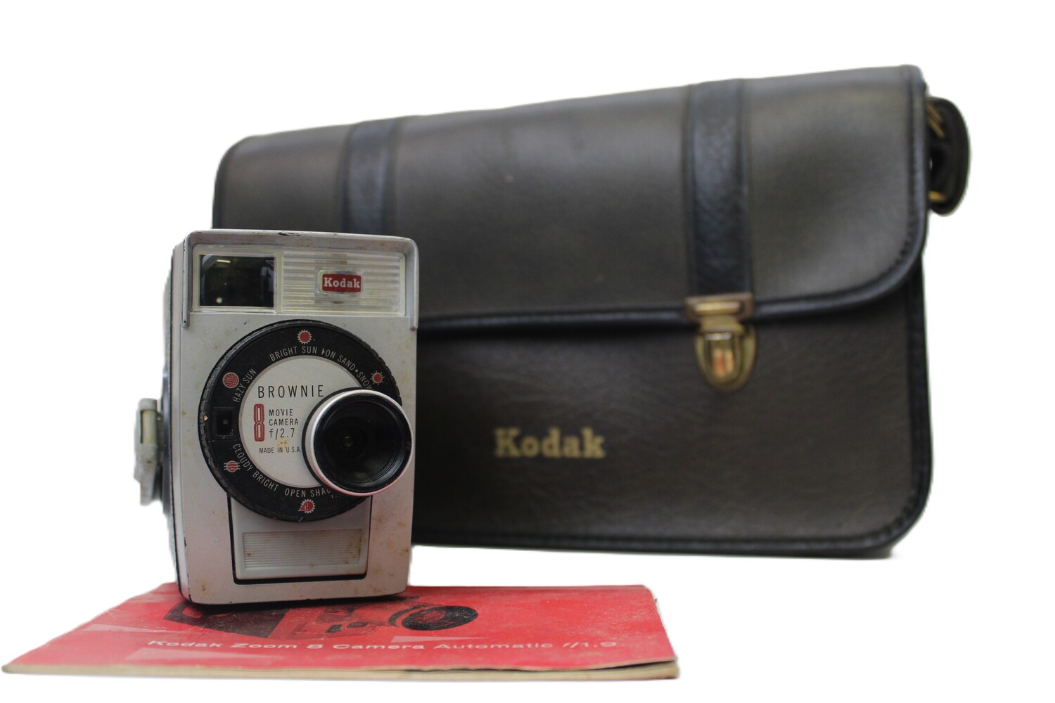 The Kodak Brownie 8mm movie camera, featuring an F/2.7 lens, was a popular consumer-level motion picture camera during the mid 20th century. Known for its simplicity and affordability, it was a preferred choice for amateur filmmakers. Its fixed-focus lens and manual exposure control offered basic, yet effective, photography options.