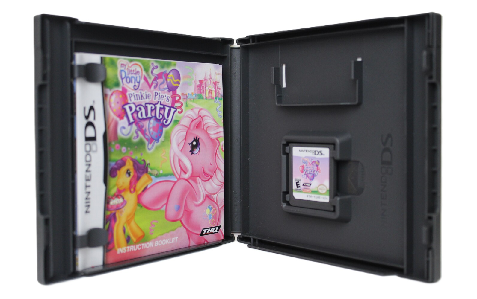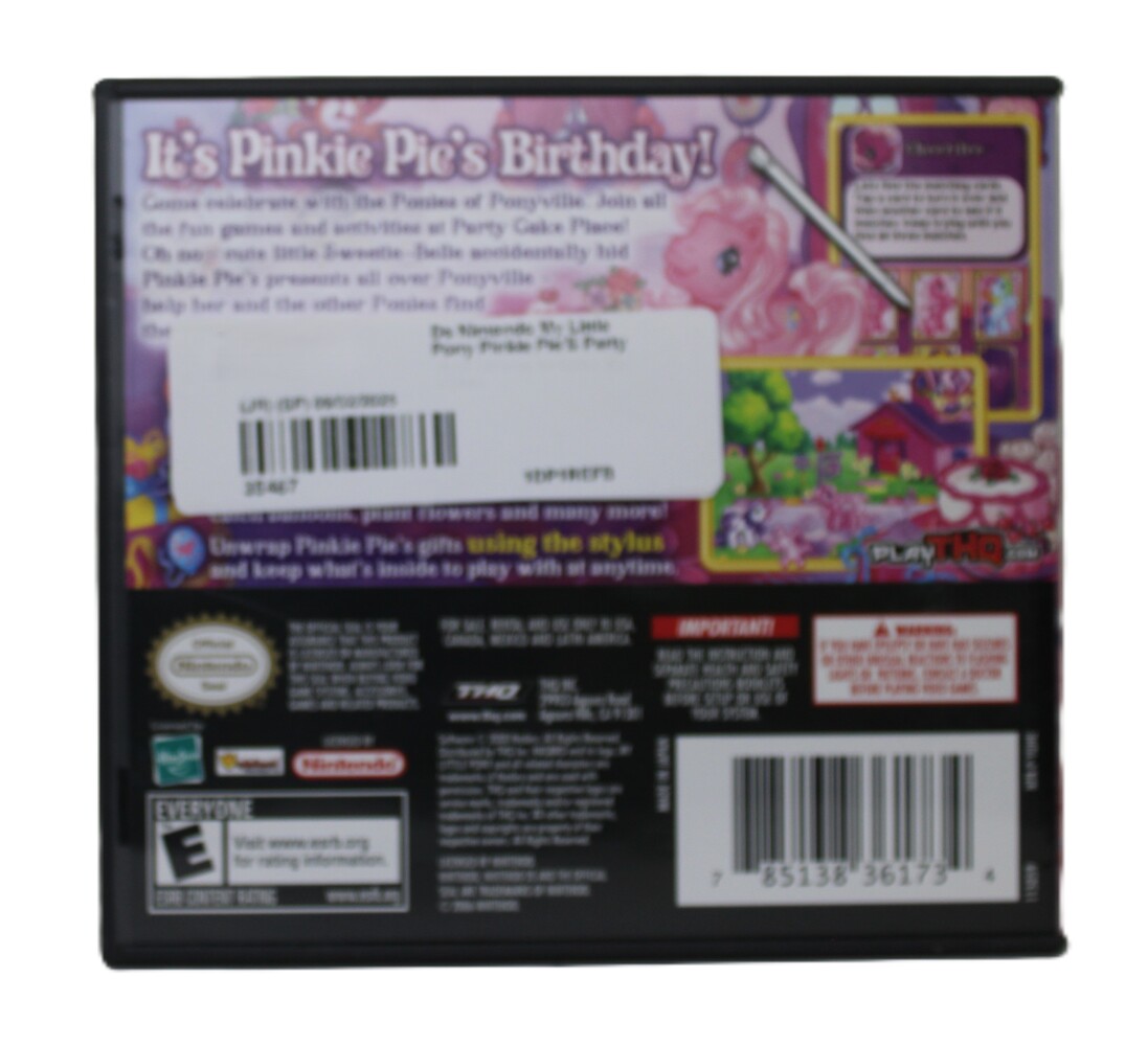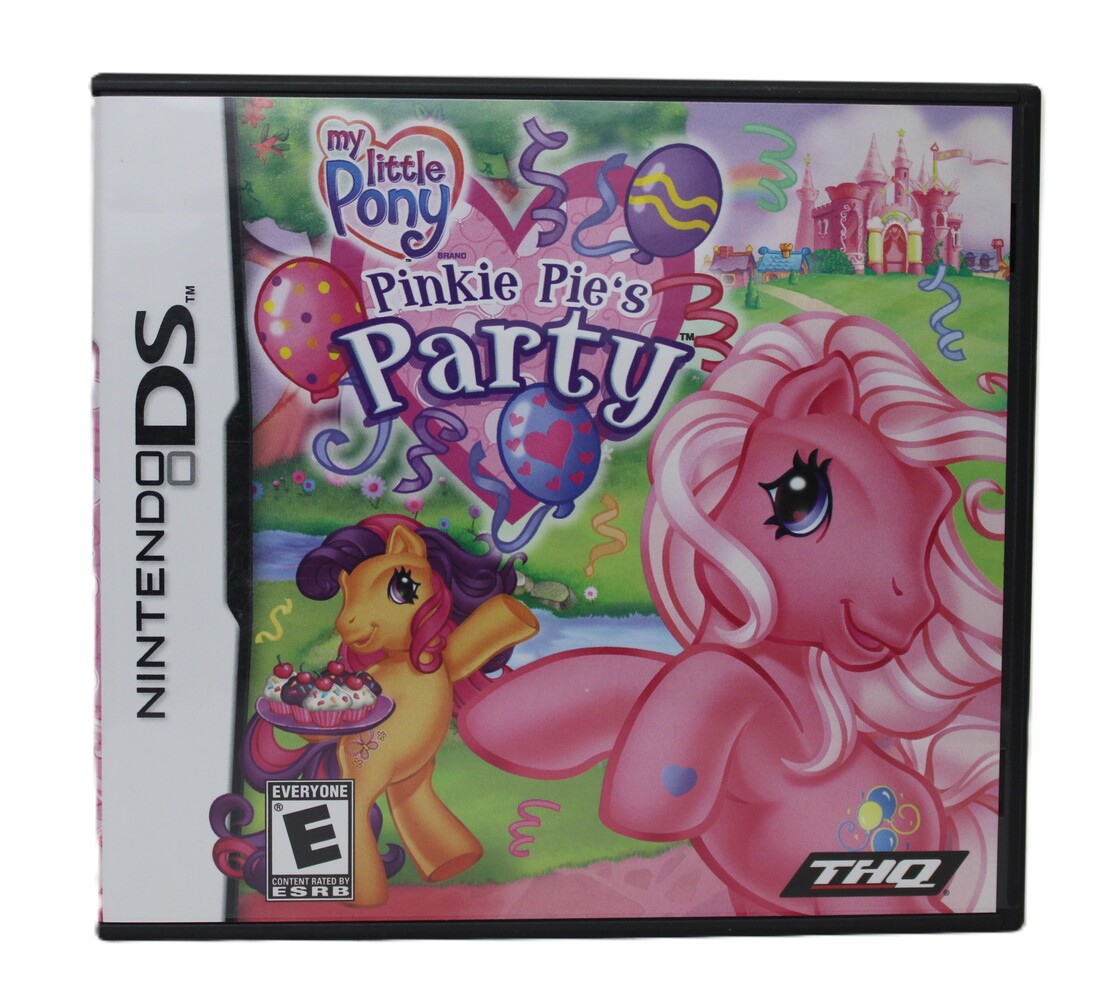 The Nintendo DS game, My Little Pony Pinkie Pie's Party, allows players to take part in Pinkie Pie's birthday party by completing fun mini-games, puzzles, and activities, with Pinkie Pie's friends throughout Ponyville. It's a family-friendly game suitable for young children.