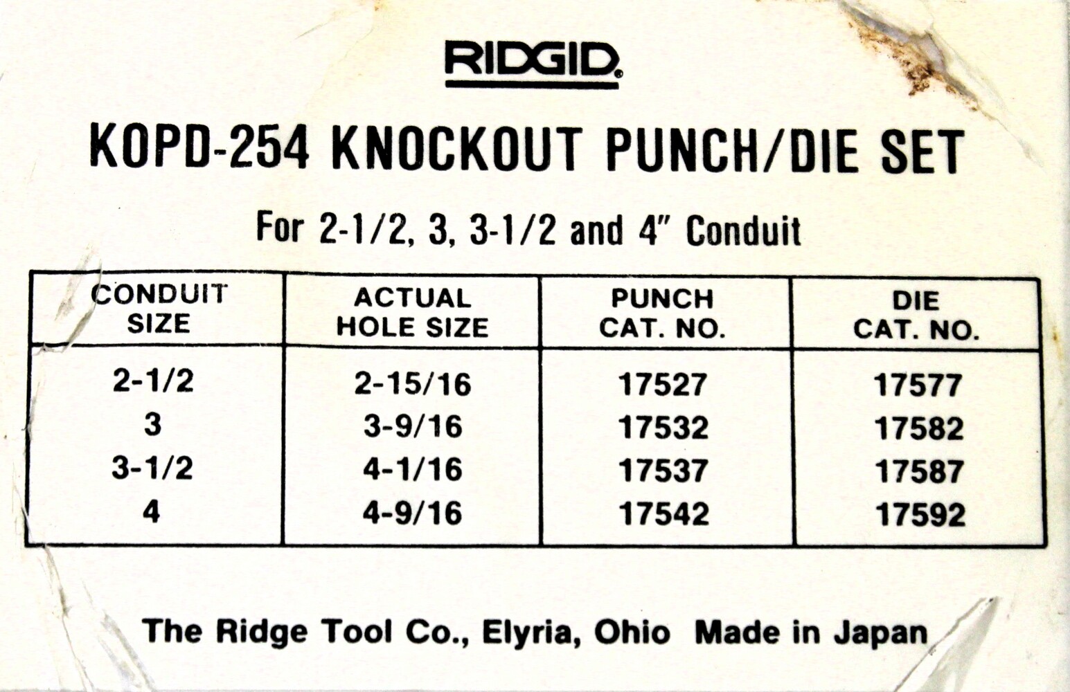 The RIDGID KOPD-254 is a 4-piece knockout punch/die set. It includes sizes ranging from 2-1/2 to 4. Precision-engineered and incredibly durable, this set is ideal for punching clean, uniform holes in metal. Trusted by professionals, RIDGID tools provide uncompromising performance for demanding jobs.
