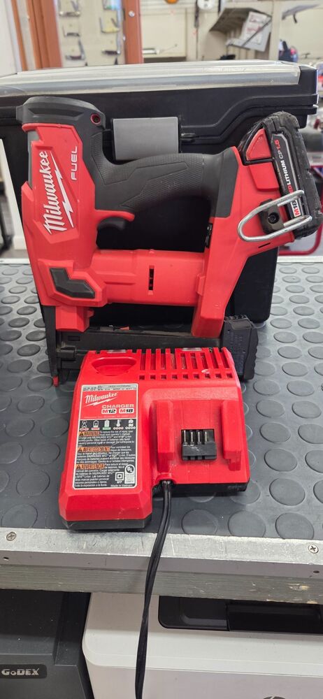 Used Milwaukee M18 Fuel 18 Volt 18 gauge 1/4" stapler with one battery and charger