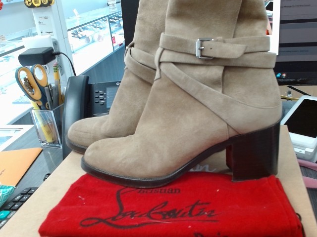| The Christian Louboutin Suede Karistrap is a premium footwear product. It features a unique design with a 70mm heel, made from high-quality suede material. The ankle boots integrate a buckled strap breaking over the arch, ensuring a secure fit and a signature Louboutin trademark-red sole. |
