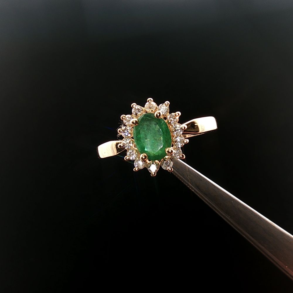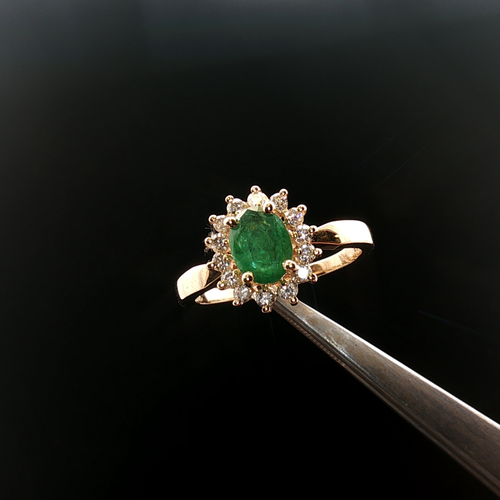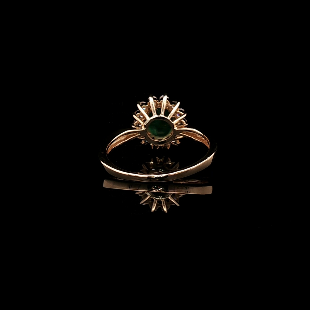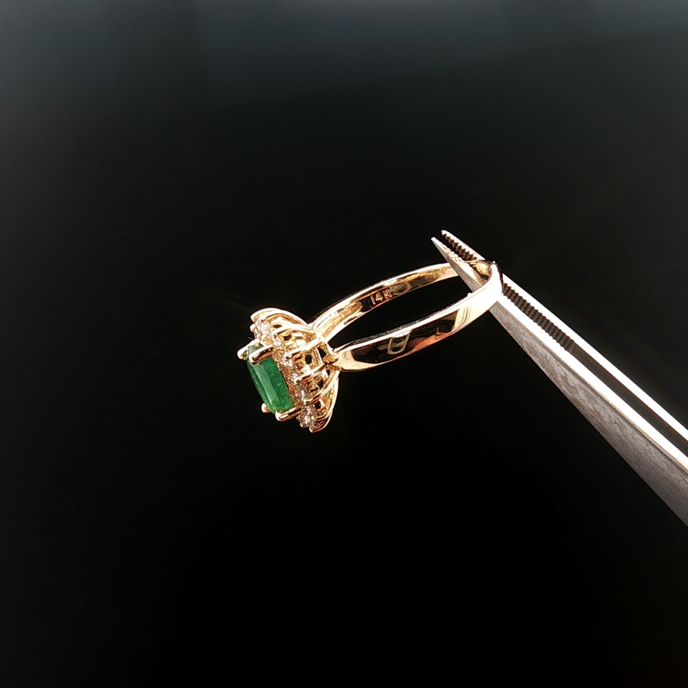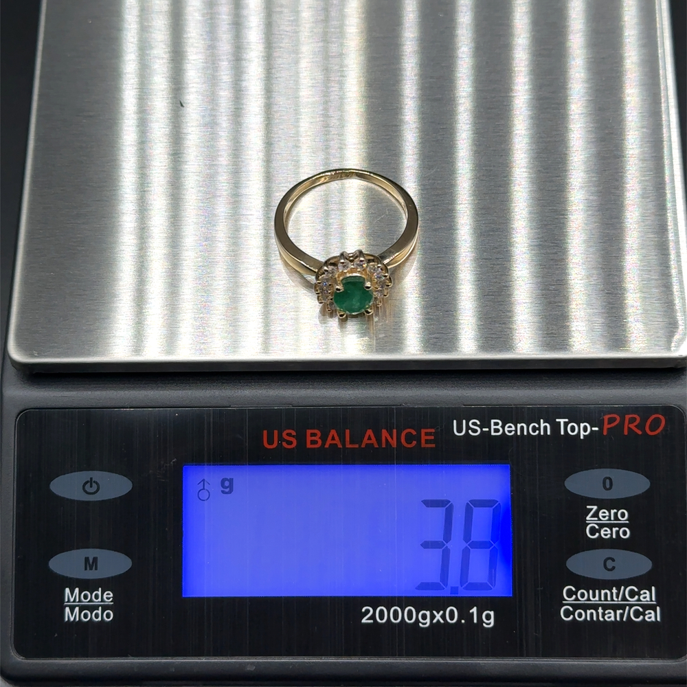 This 14KT yellow gold ring showcases a vibrant .96 CTTW emerald accented by sparkling .40 CTTW diamonds, creating a striking and elegant design. The polished gold band enhances the rich green hue of the emerald and the brilliance of the diamonds, offering a timeless and sophisticated look. Sized at 9, the ring provides a comfortable and flattering fit, perfect for both special occasions and everyday wear.