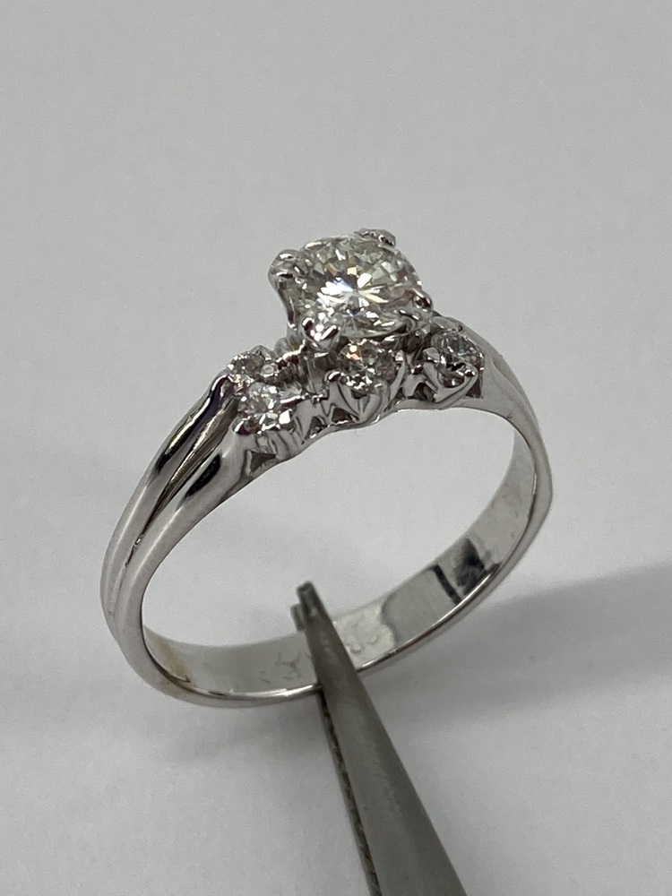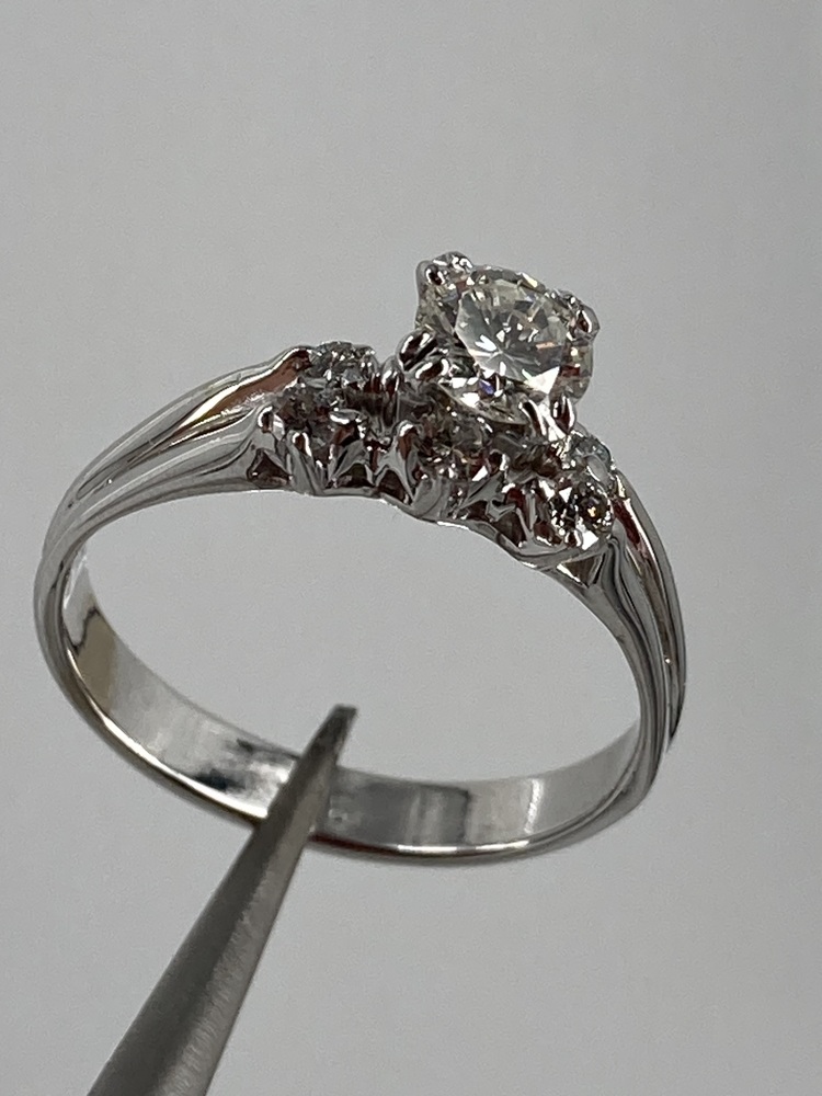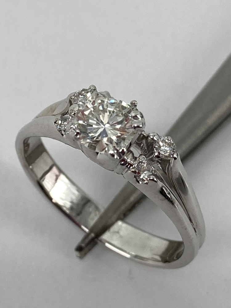 Complementing the central diamond are approximately 13 points total weight of side diamonds. These side diamonds are meticulously set to enhance the overall brilliance and fire of the ring, creating a harmonious design that accentuates the central stone without overpowering it. The side diamonds, like the central stone, are chosen for their clarity and color to ensure a cohesive and captivating appearance.