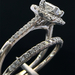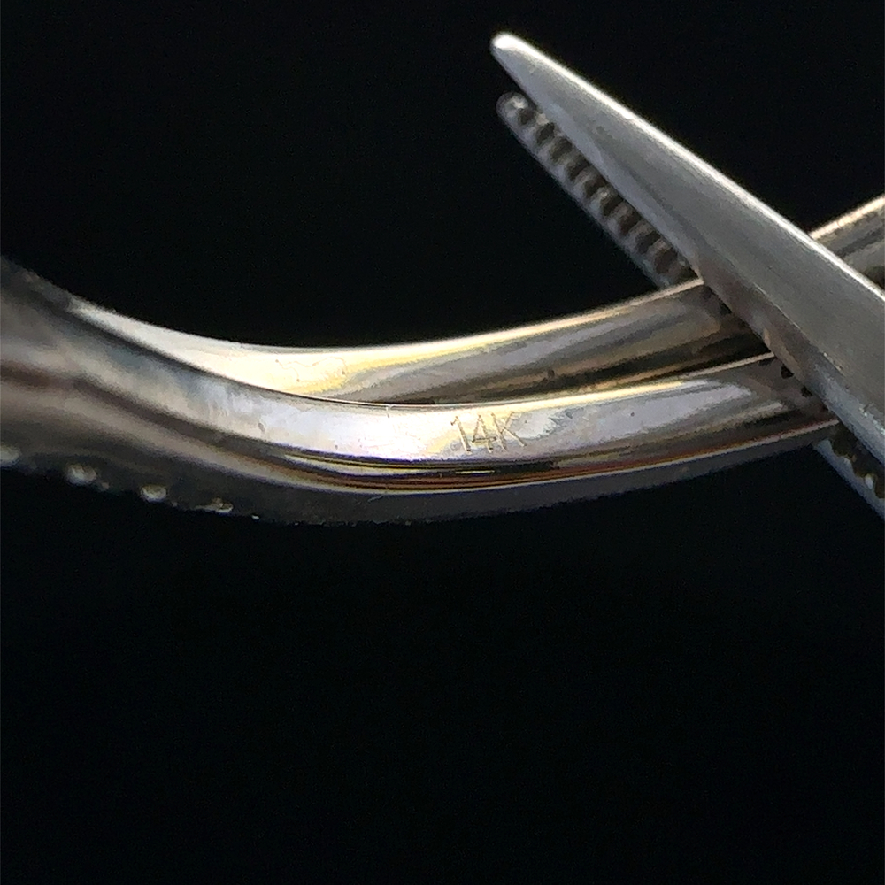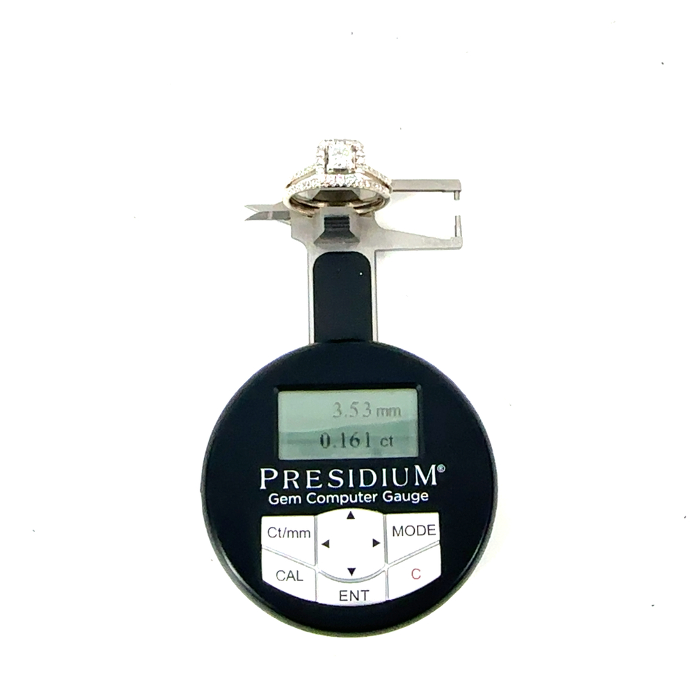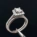 Features include a 14KT white gold band weighing 5.7 grams, featuring a square-cut diamond of approximately 0.73 carats with Si2-H clarity, accompanied by side diamonds totaling around 0.40 carats for enhanced brilliance.