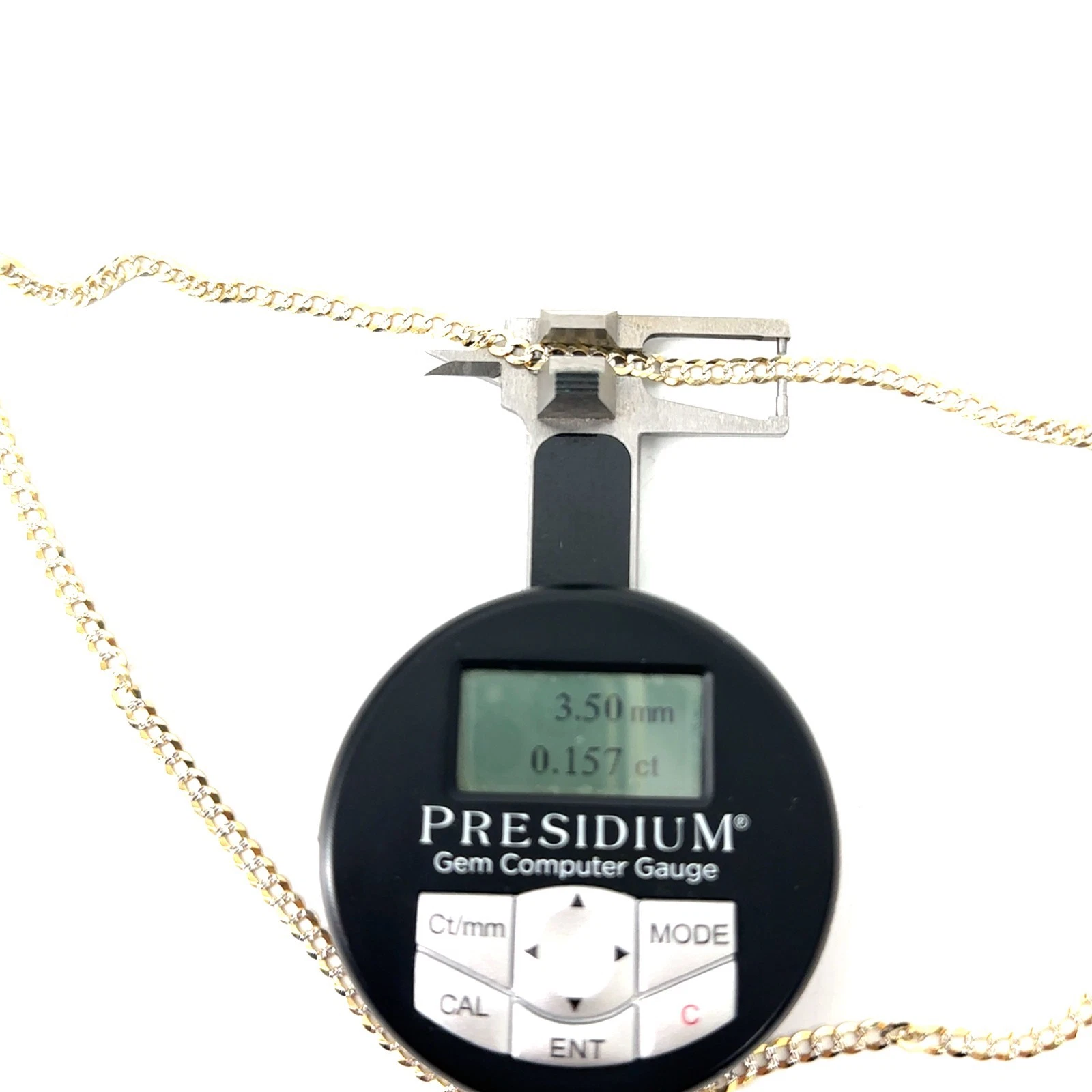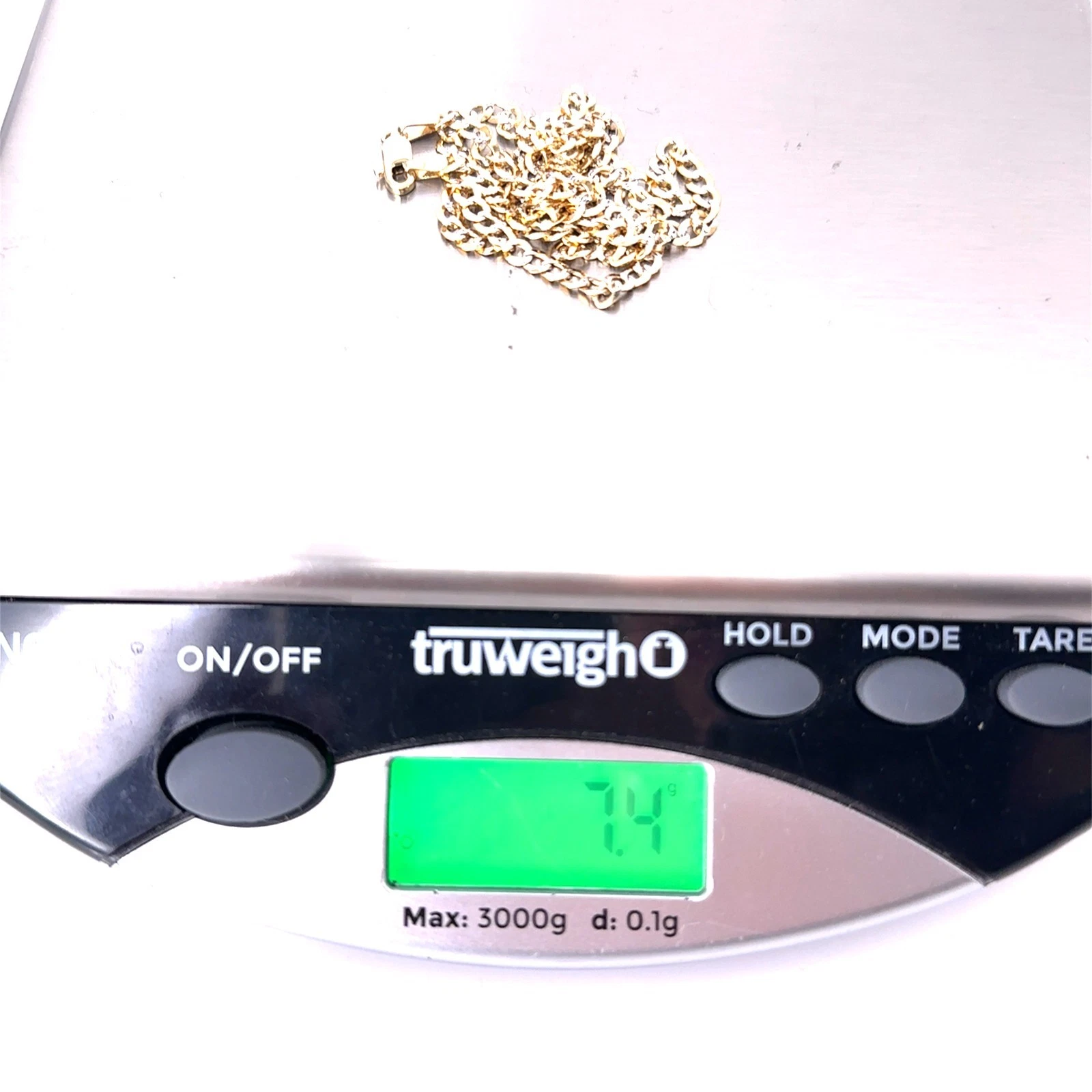 Made from 14KT yellow gold, this diamond cut curb link necklace measures 20 inches in length and weighs 7.4 grams. Features a polished and faceted design that catches light for a sparkling, eye-catching effect.