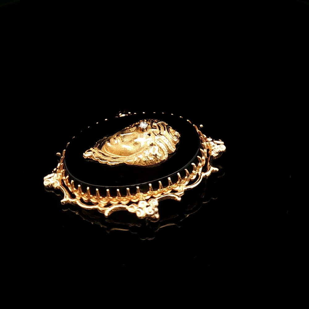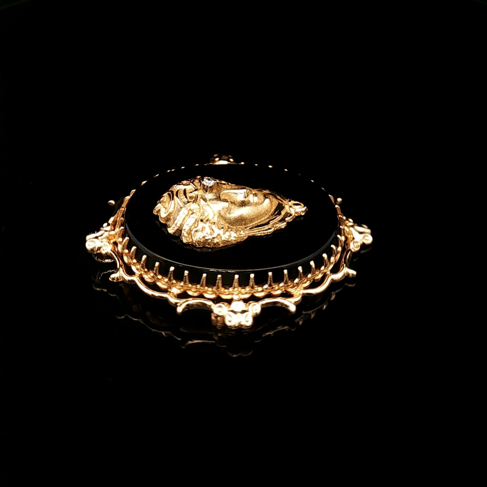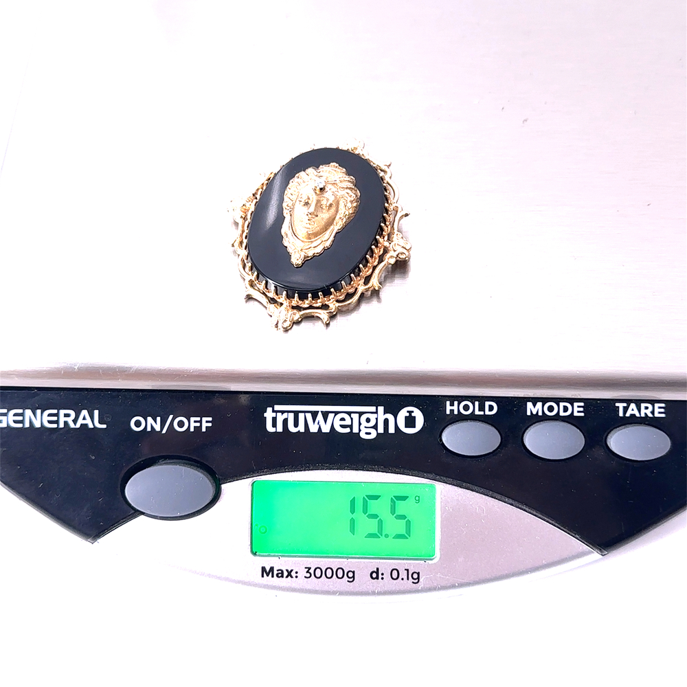 Made of 14KT yellow gold, this brooch features a finely carved onyx cameo set in a polished gold frame, weighing 15.5 grams. The detailed design highlights the contrast between the dark onyx and the gold, creating a classic and elegant appearance.