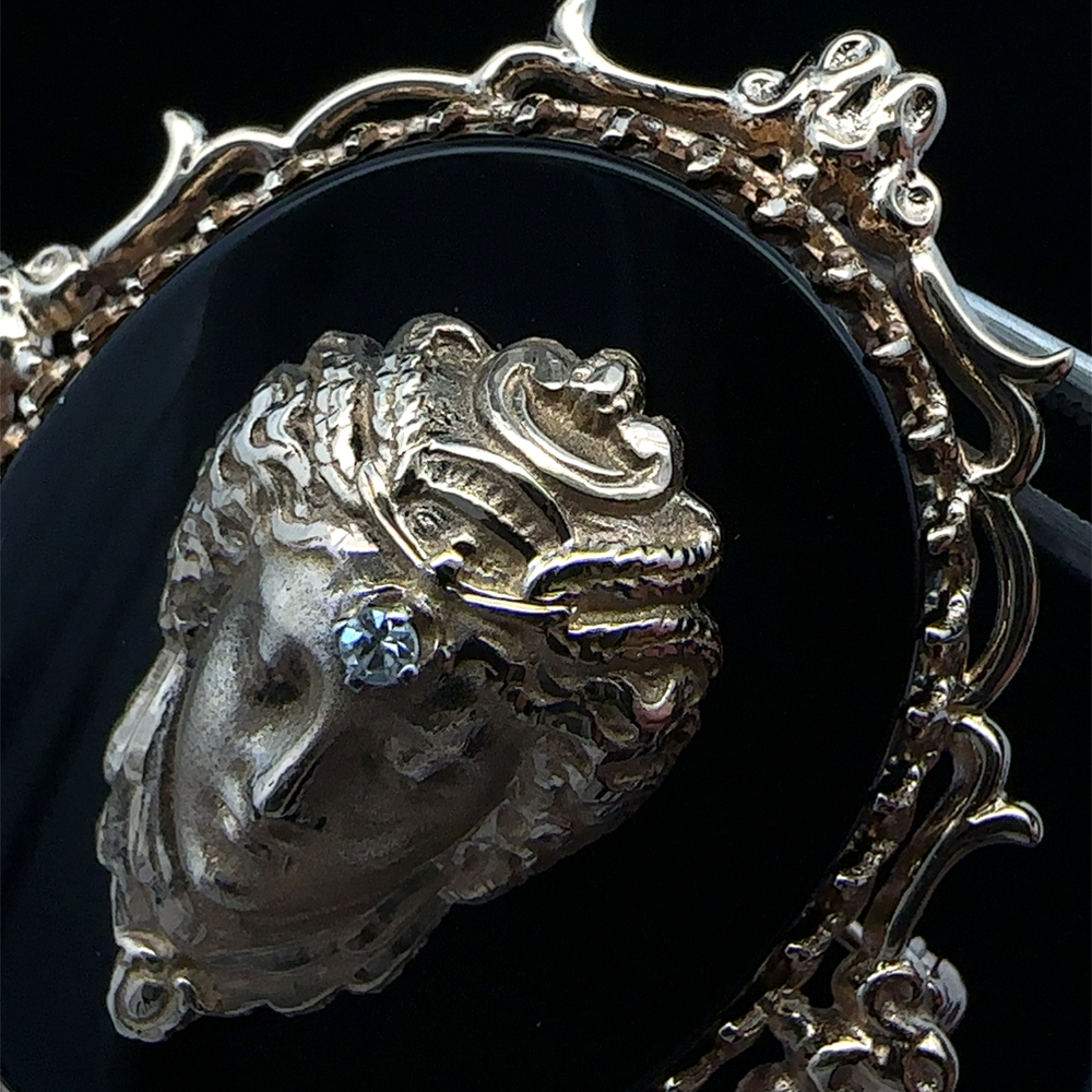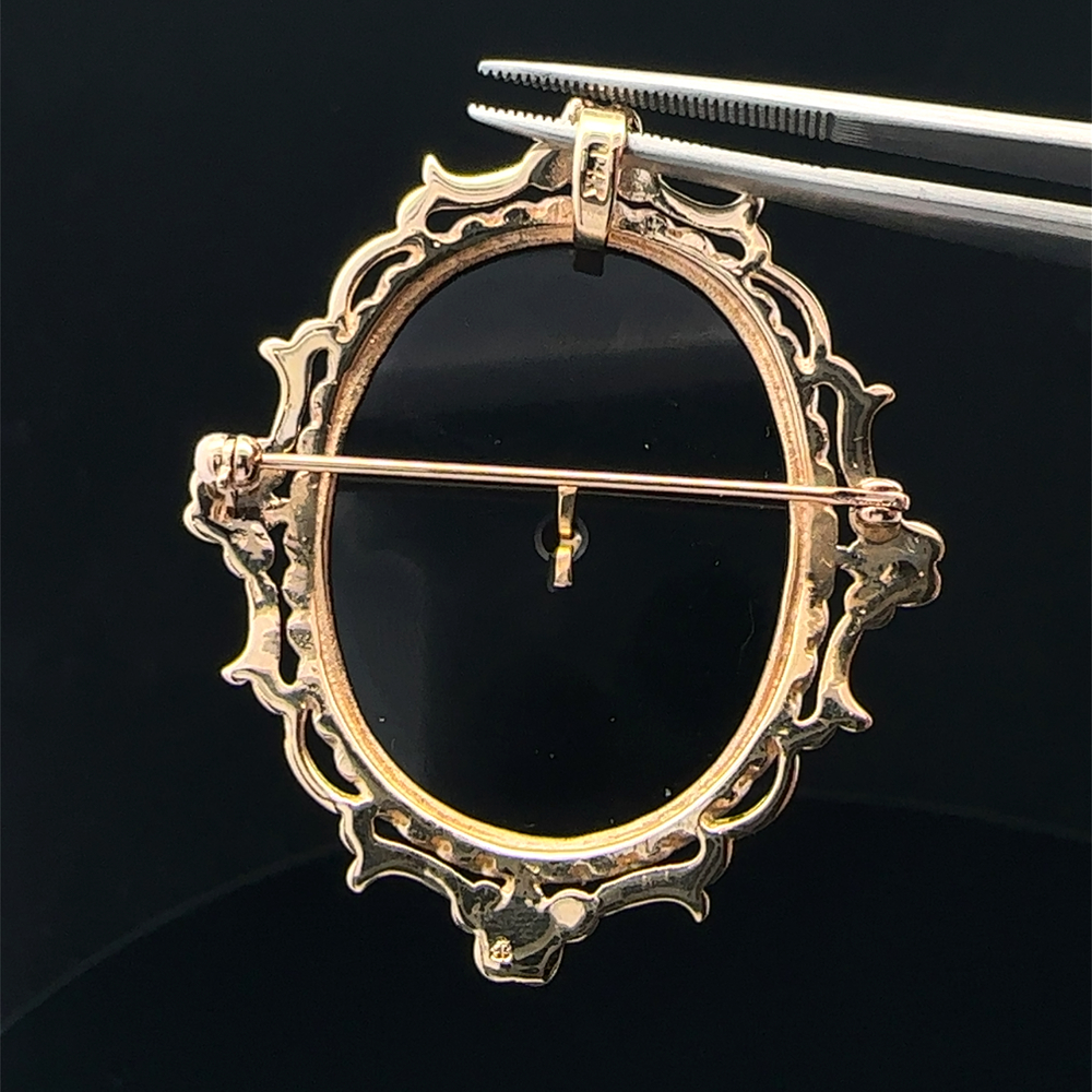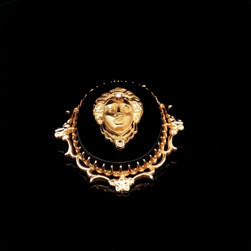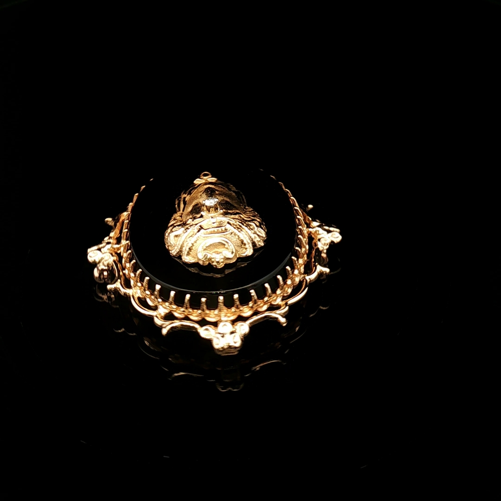 Made of 14KT yellow gold, this brooch features a finely carved onyx cameo set in a polished gold frame, weighing 15.5 grams. The detailed design highlights the contrast between the dark onyx and the gold, creating a classic and elegant appearance.