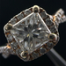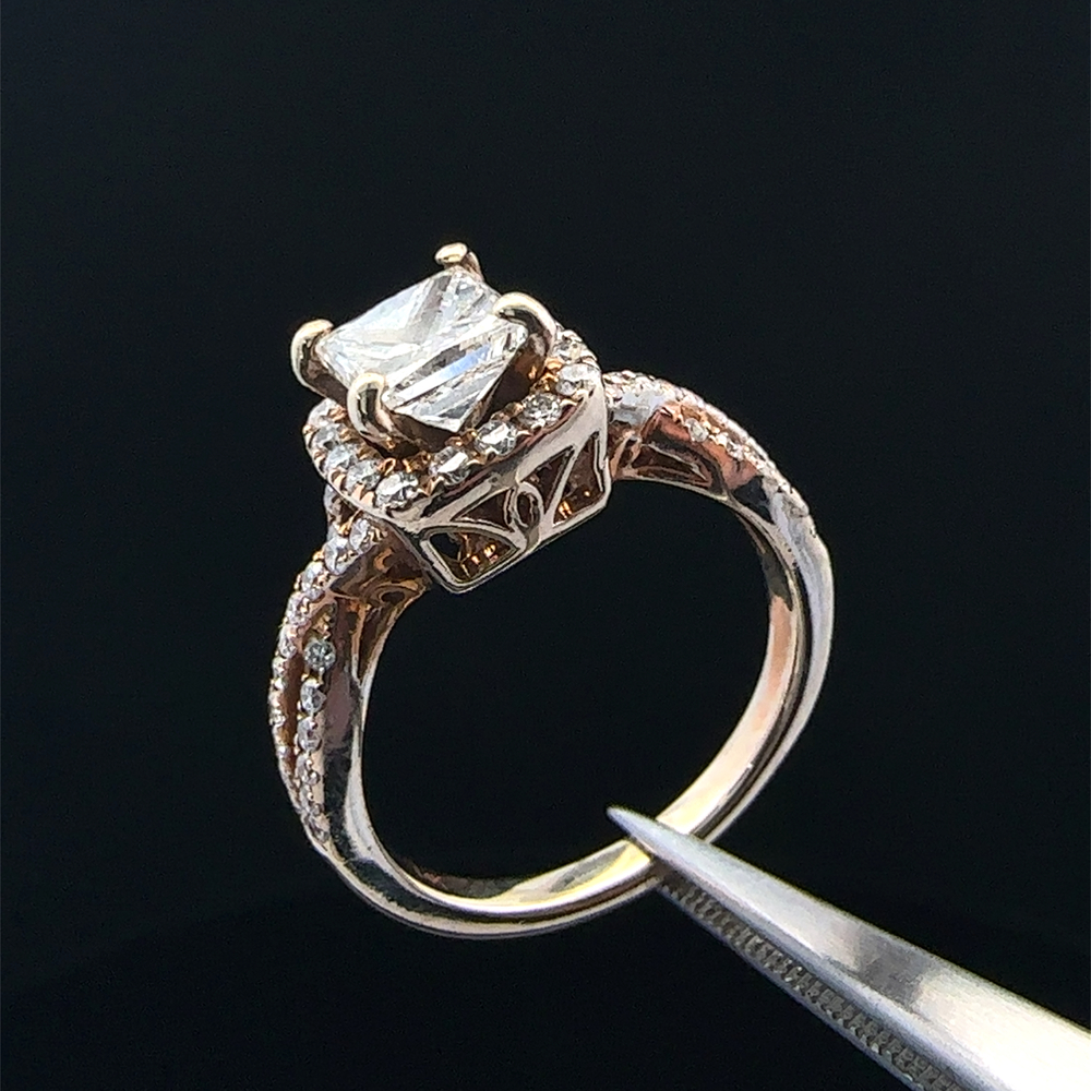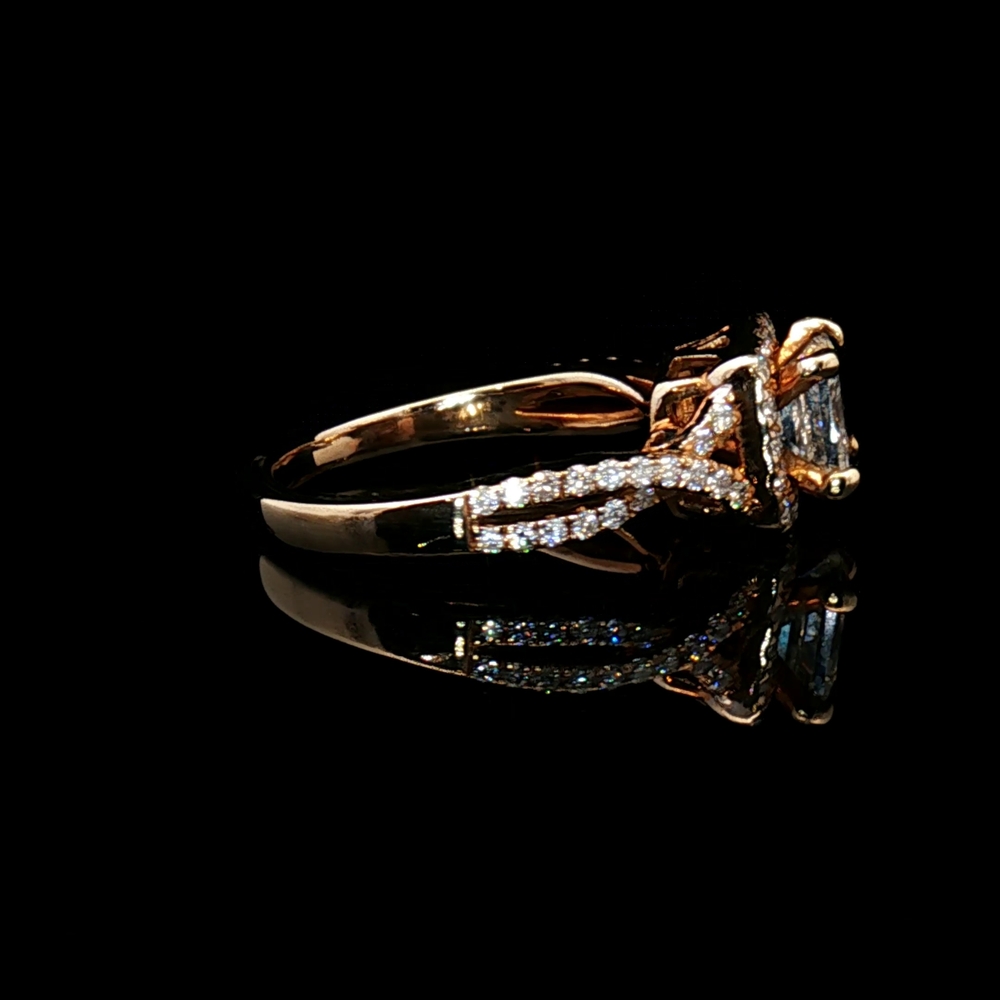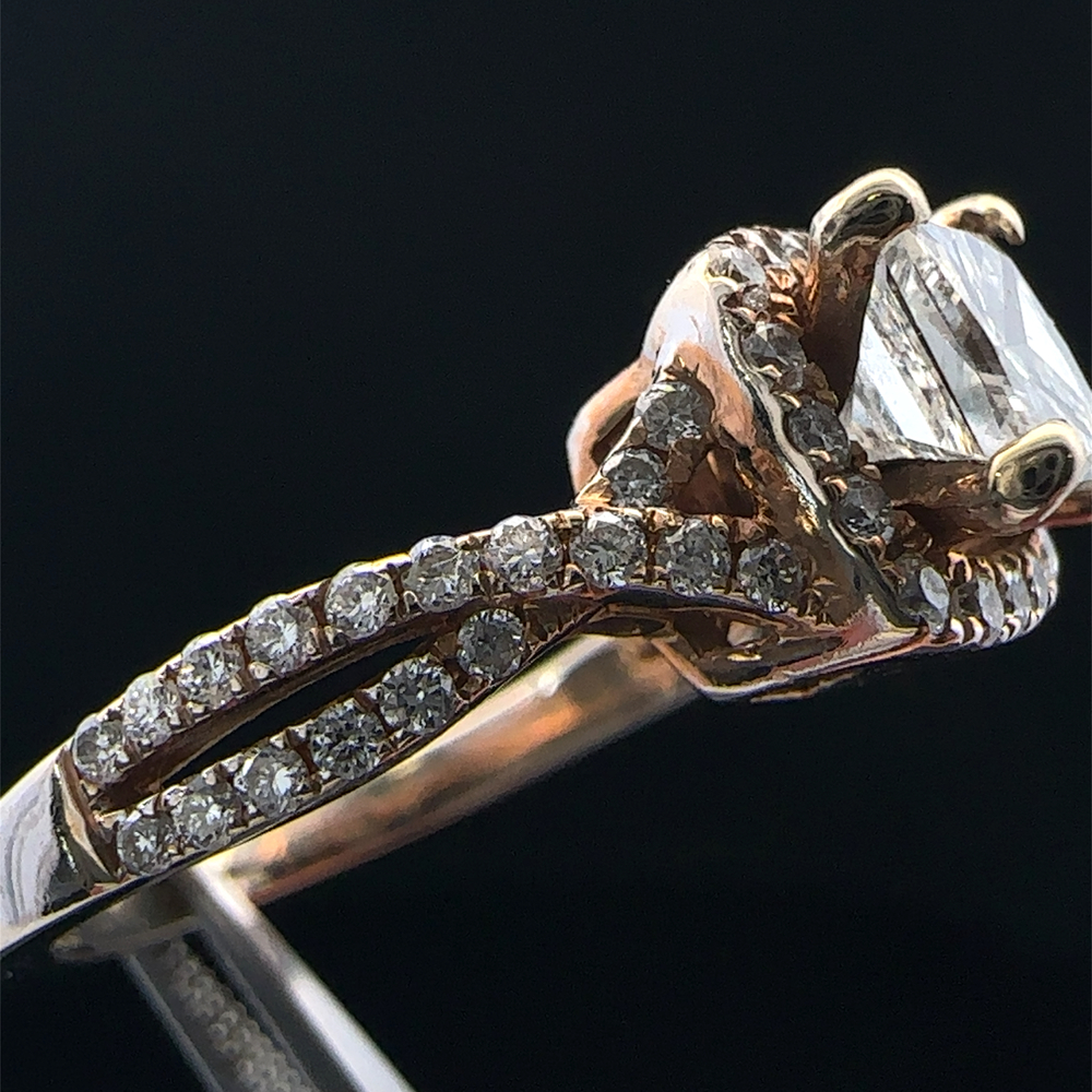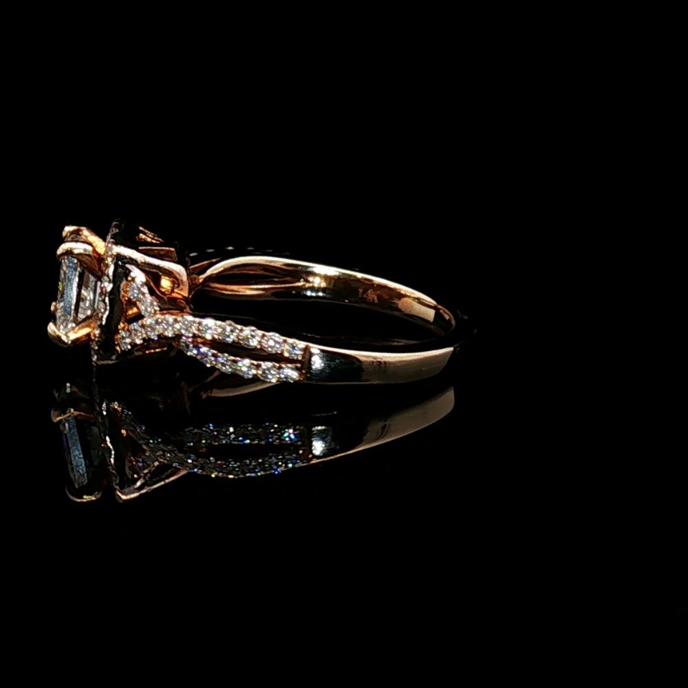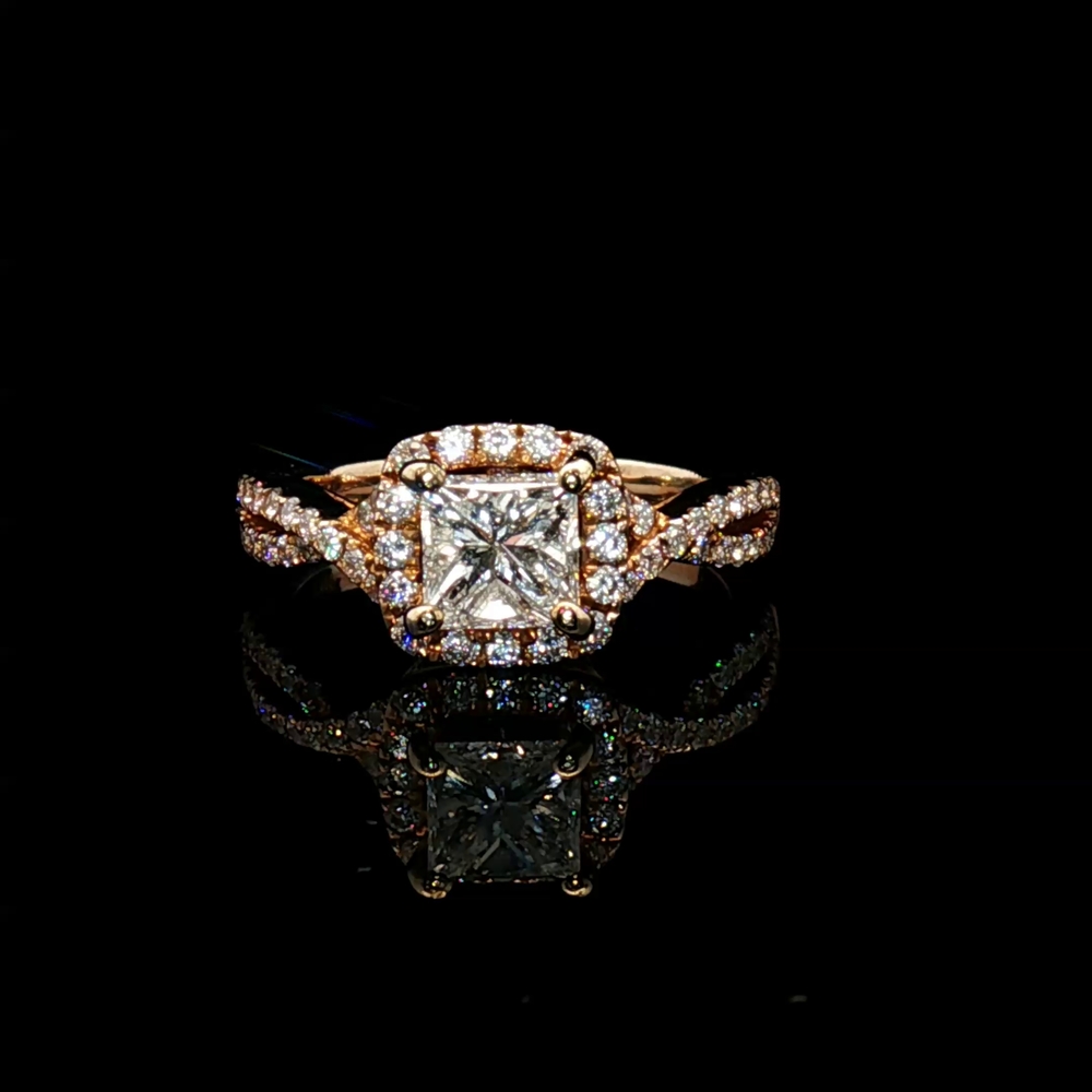 Features include a 14KT yellow gold band with a polished finish, showcasing a princess-cut diamond of approximately 0.99 carats with Si2-3 clarity and high-quality sparkle, complemented by side diamonds totaling around 0.36 carats for added brilliance.