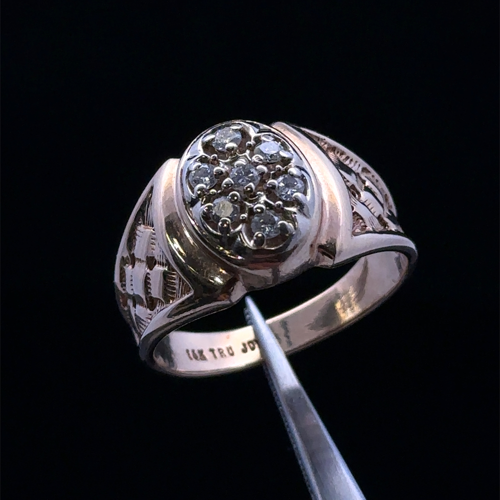 14KT yellow gold ring featuring a bright diamond cluster totaling approximately 1/3 carat. The cluster design enhances sparkle and creates a clean, elegant look that stands out without being overpowering. Ring is a size 10, offering a timeless style suitable for both everyday wear and special occasions.
