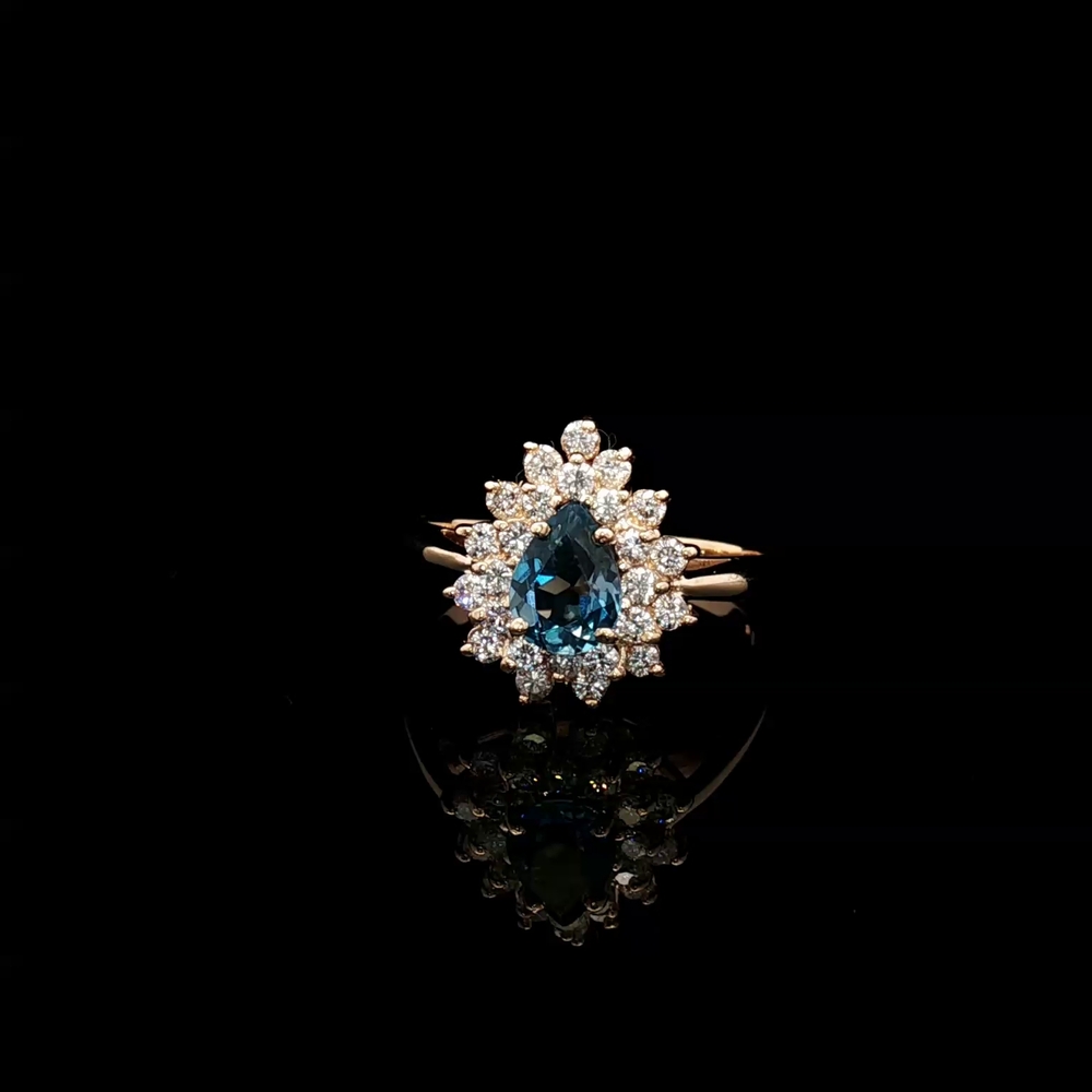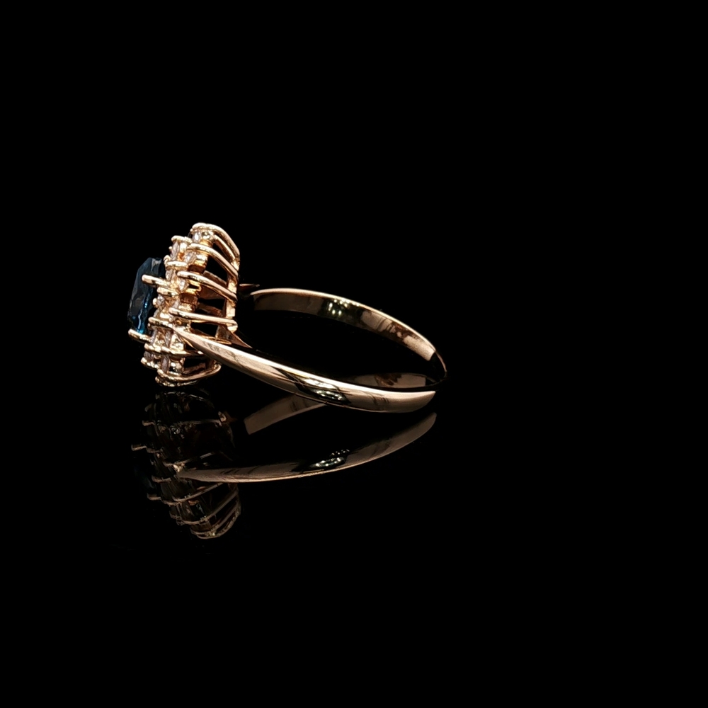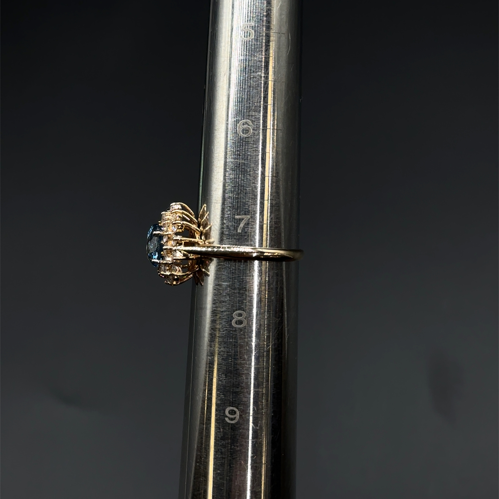 This 14KT yellow gold ring features a sparkling blue topaz centerpiece accented by a total of .60 carat diamonds, adding brilliance and elegance. The band is polished to a high shine, enhancing the rich gold color and complementing the gemstones beautifully. Designed for comfort and style, this ring is a stunning addition to any jewelry collection and is a perfect choice for special occasions or everyday wear. Sized at 7.25, it offers a flattering fit.