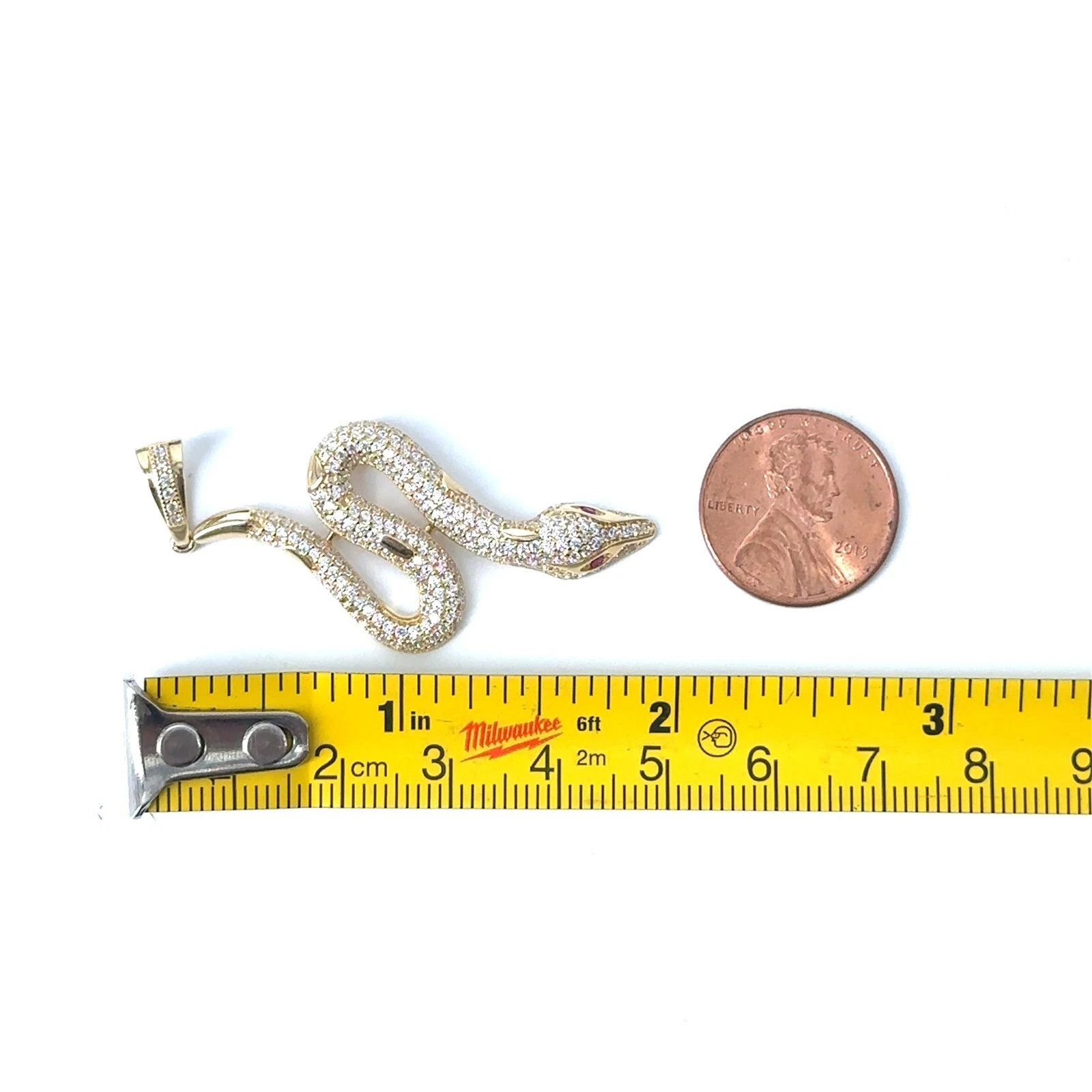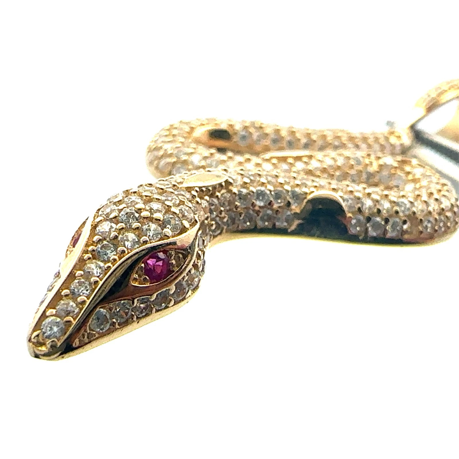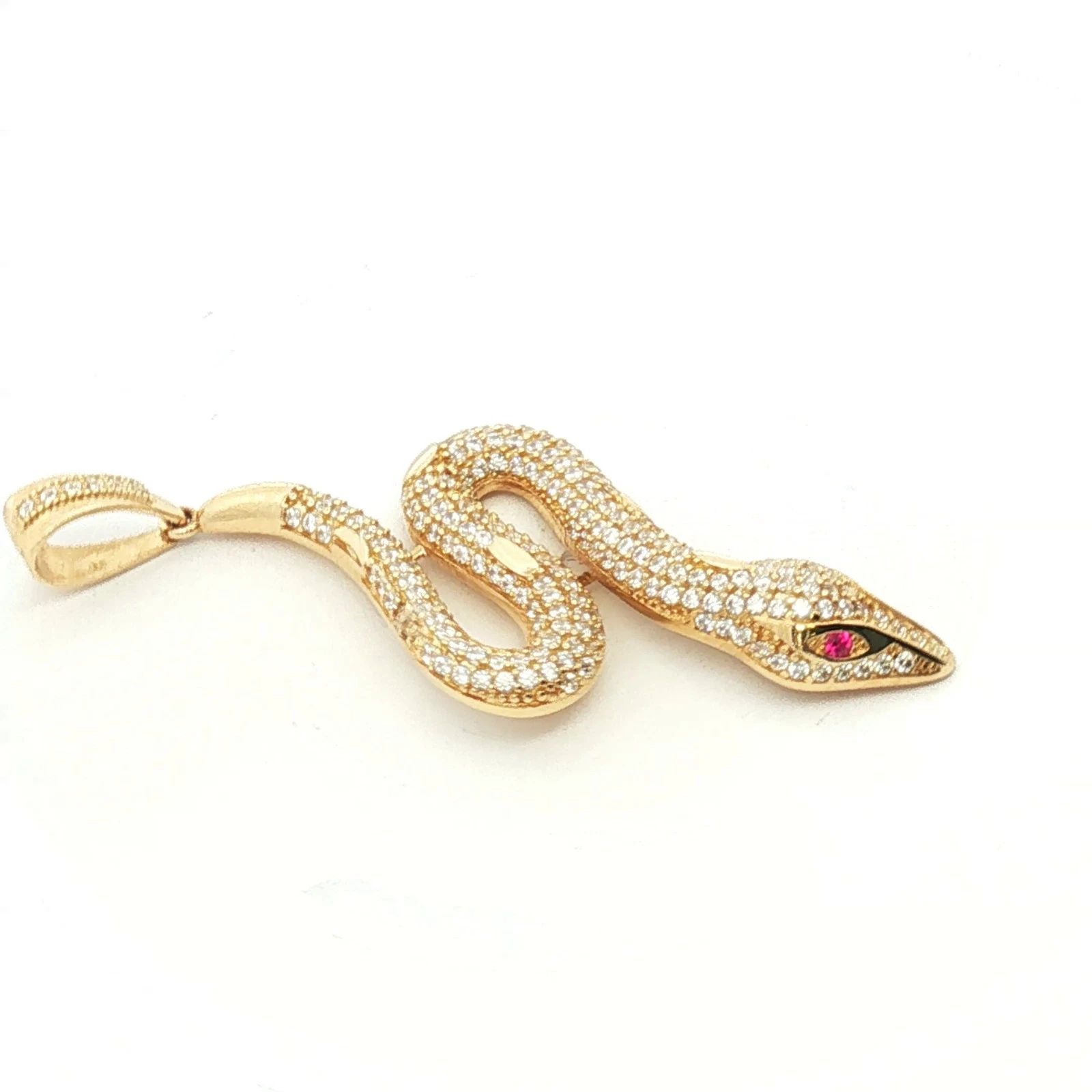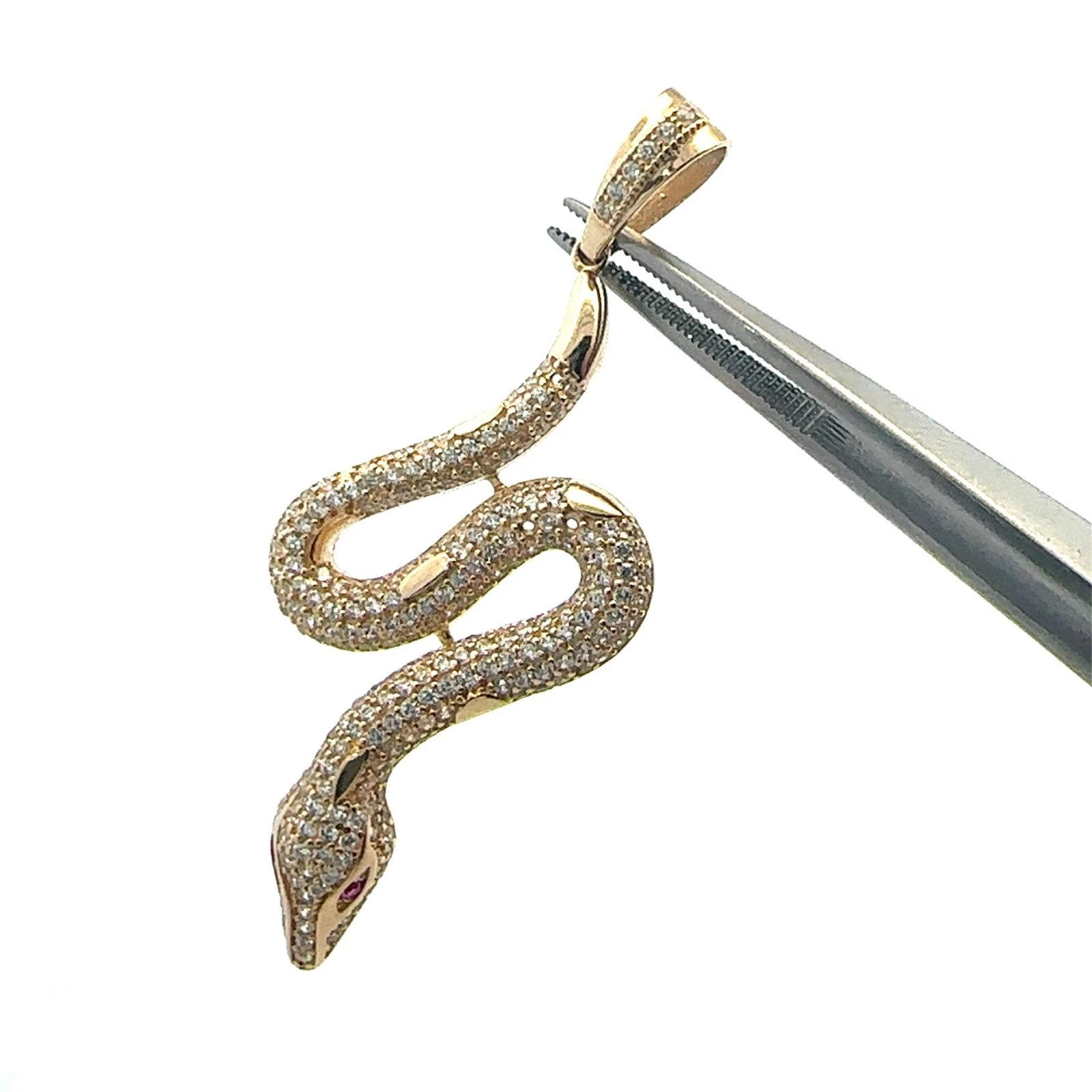 Made of 14KT yellow gold, this snake pendant features a detailed and elegant design accented with sparkling cubic zirconia stones that enhance its shine and visual appeal.