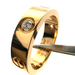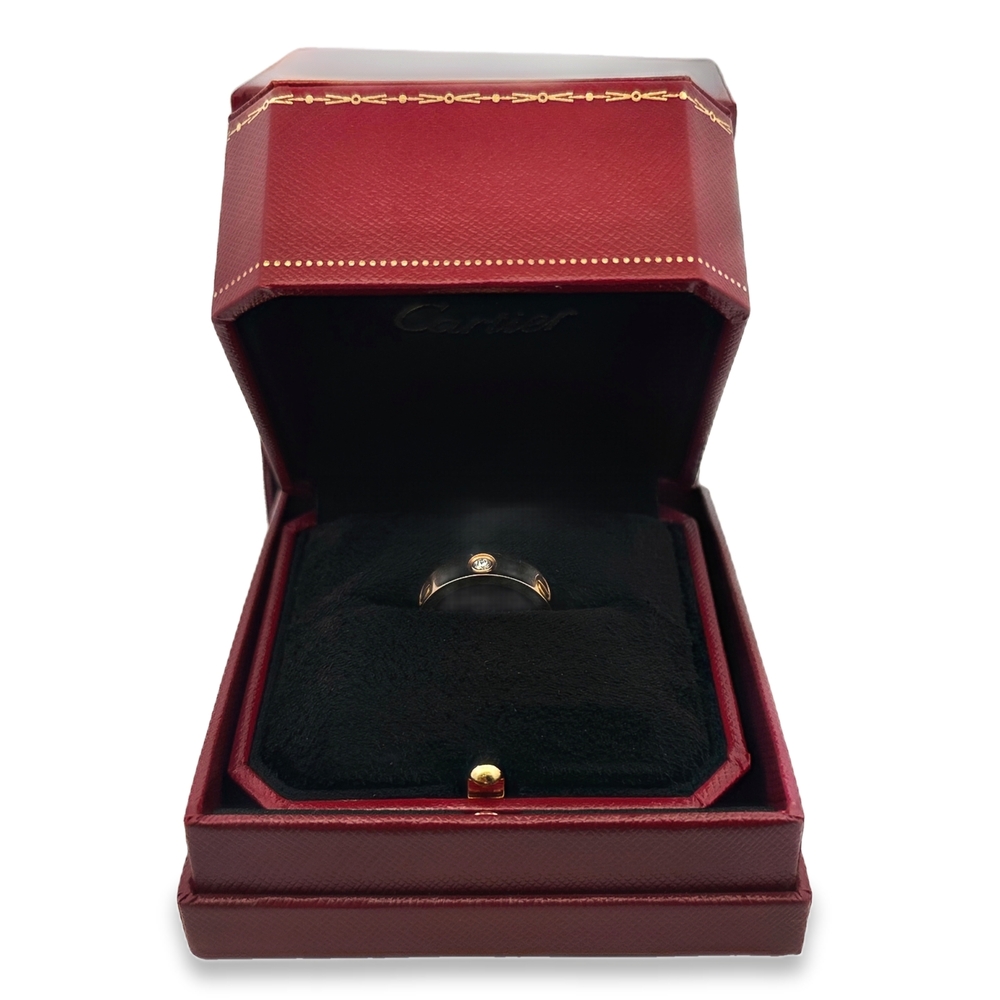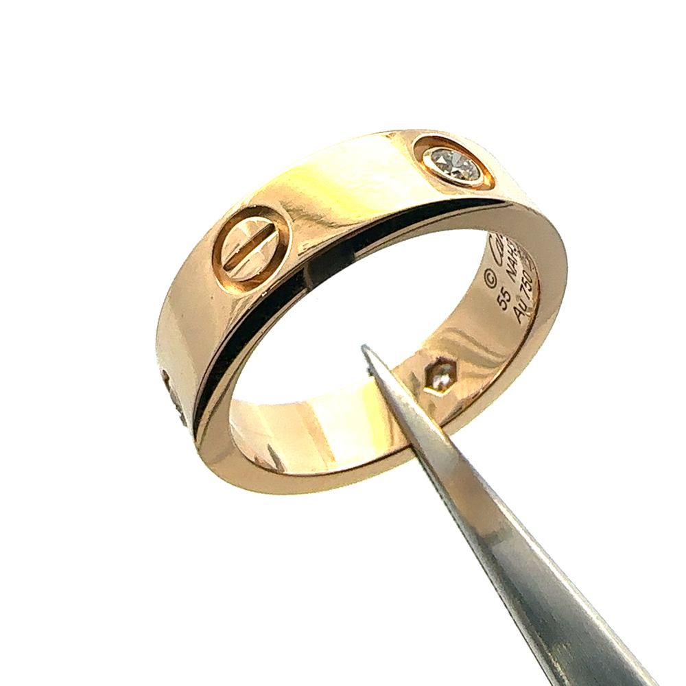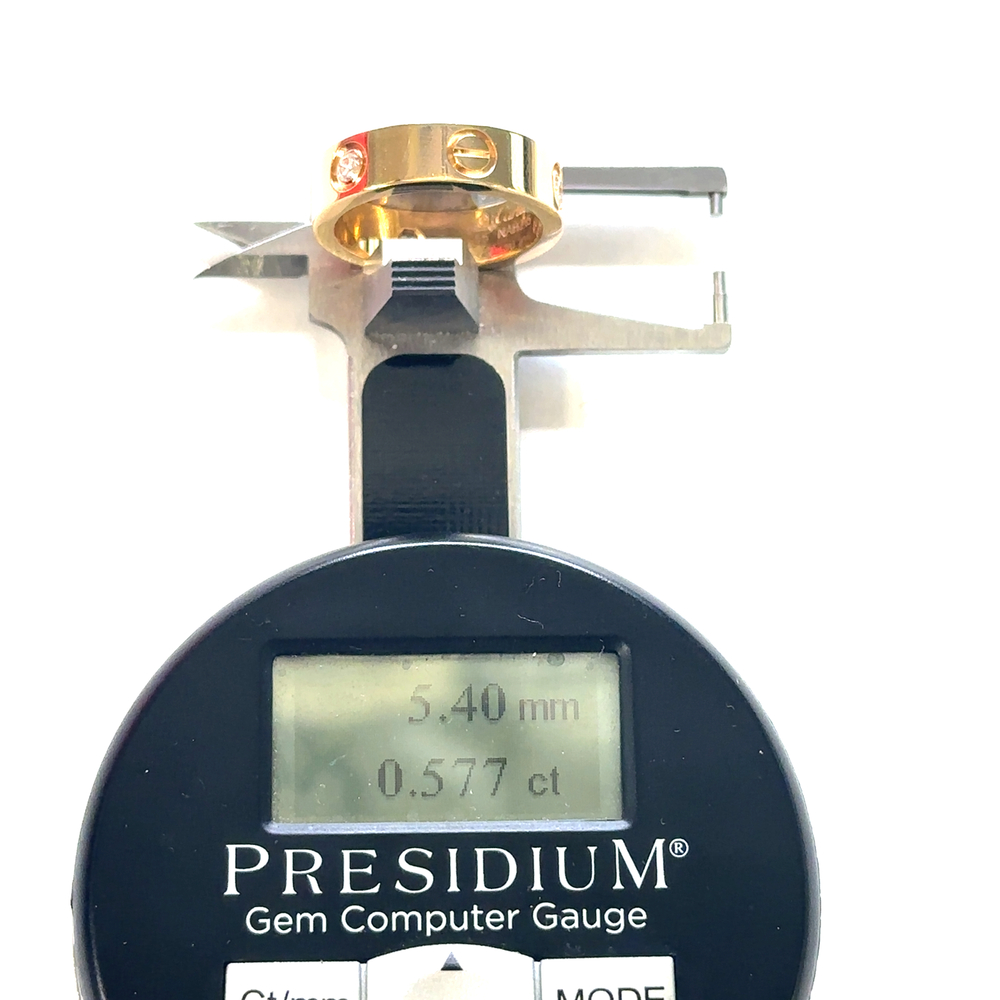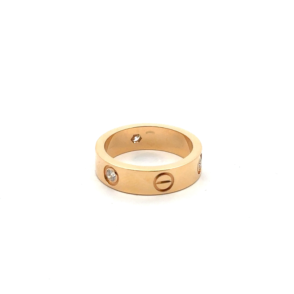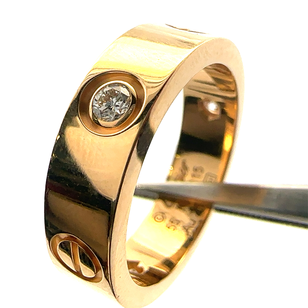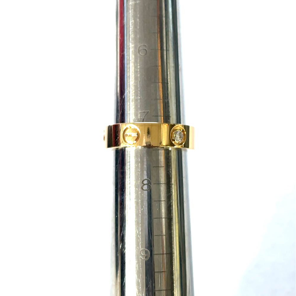 Made of 18KT yellow gold, this Cartier Love ring features a series of sparkling diamonds set around the band, combining luxury and timeless elegance. Sized at 7.25, the ring offers a polished finish and signature screw motifs that enhance its iconic design.