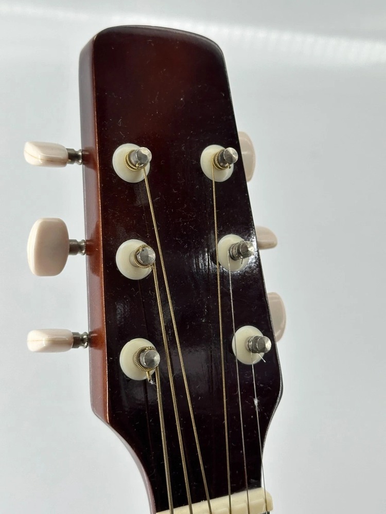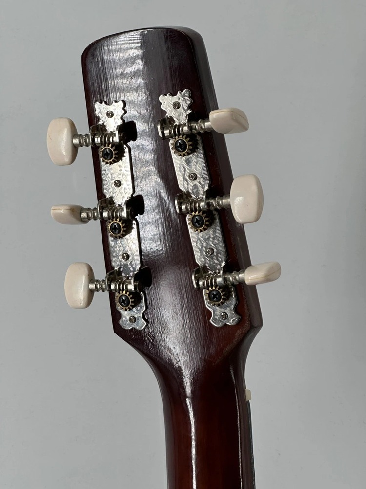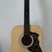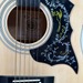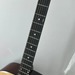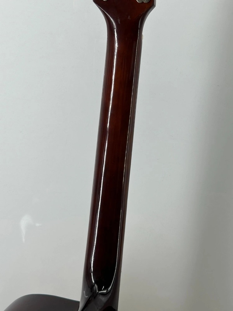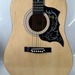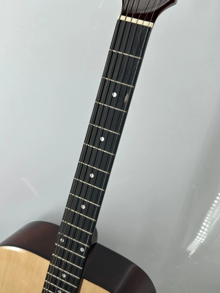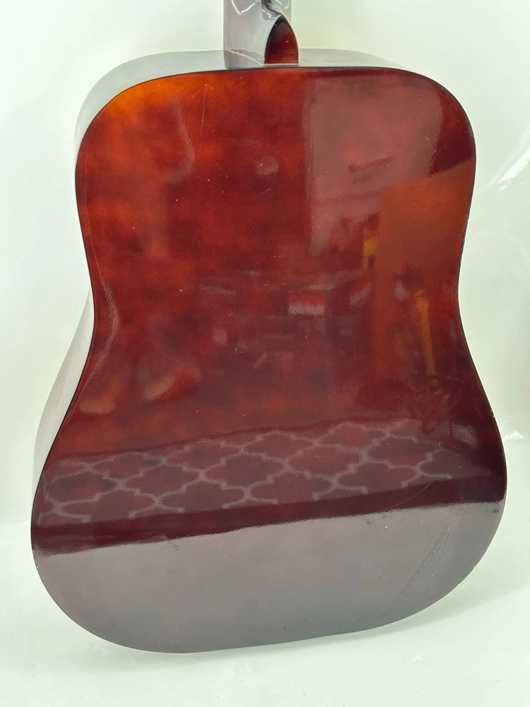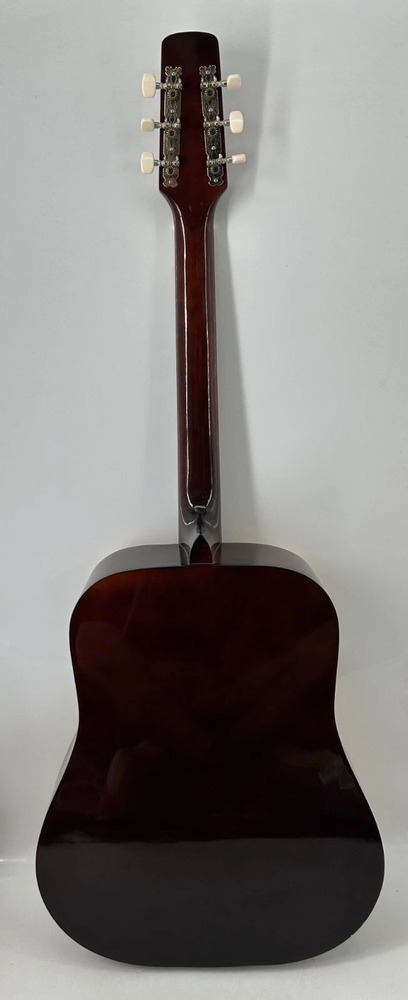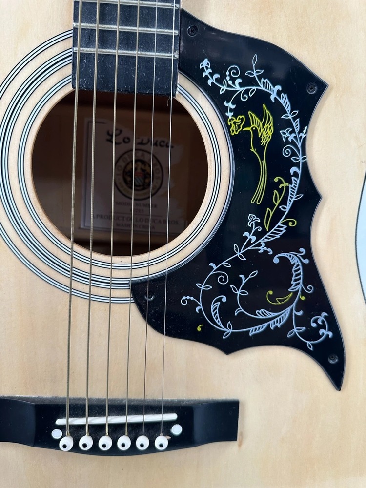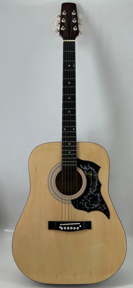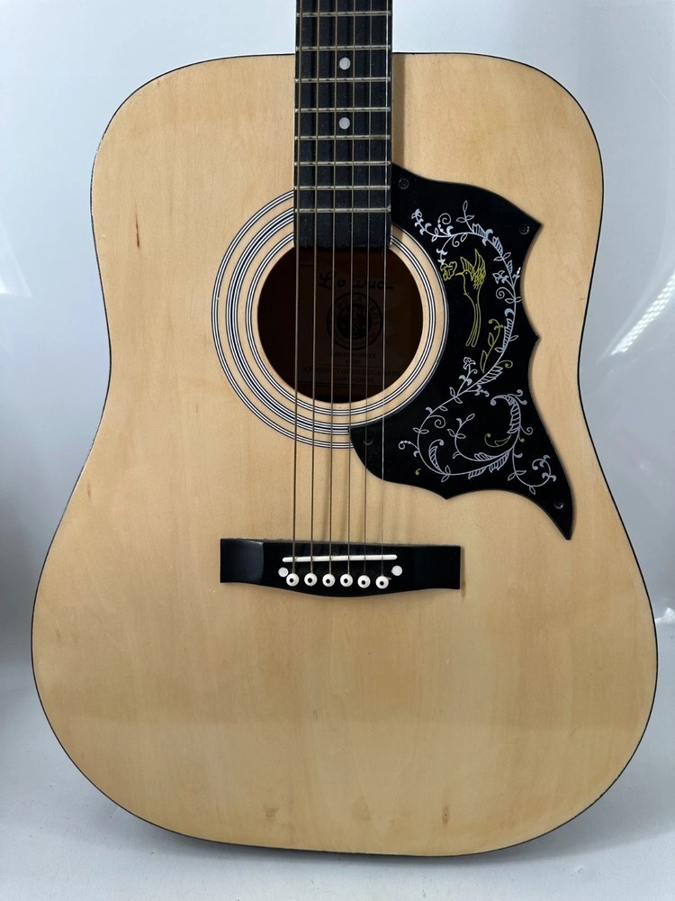 This acoustic guitar features a solid wood top that enhances resonance and tonal clarity, producing rich, warm sounds that are well suited for a variety of musical styles. The natural wood grain visible on the body adds a classic aesthetic appeal, making it as beautiful to look at as it is to play.