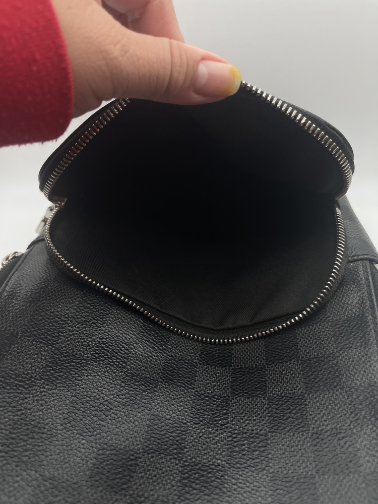 The Louis Vuitton Avenue Damier Graphite Sling Bag features sleek black and gray coated canvas with a modern, streamlined design. Compact yet functional, it offers convenient storage with a secure zip closure—perfect for everyday essentials. A stylish, versatile luxury piece ideal for daily wear or travel.