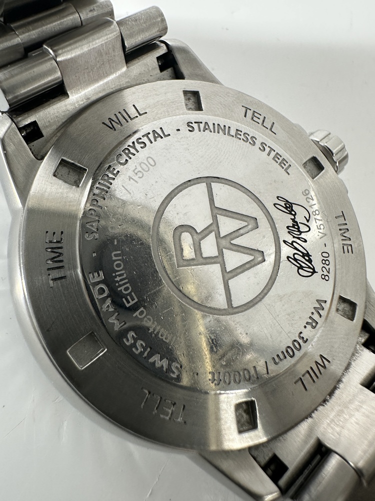 Features a polished stainless steel case and bracelet with a striking black dial inspired by Bob Marley. Quartz movement provides precise and reliable timekeeping. Luminous hands and markers ensure visibility in low light conditions.