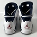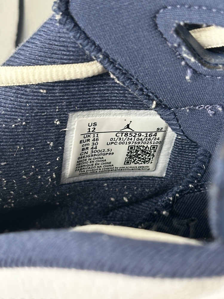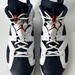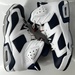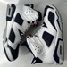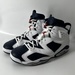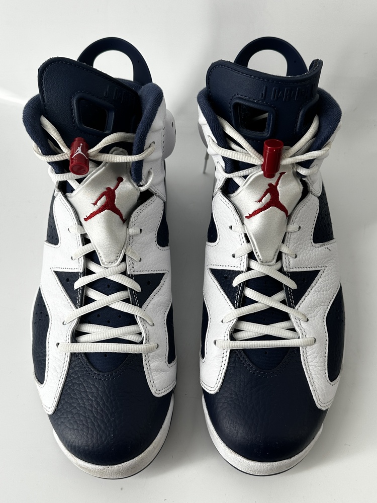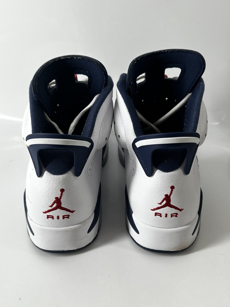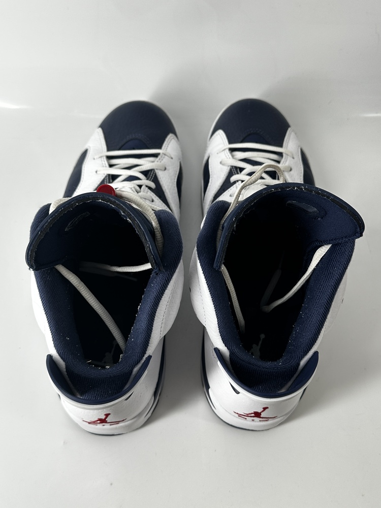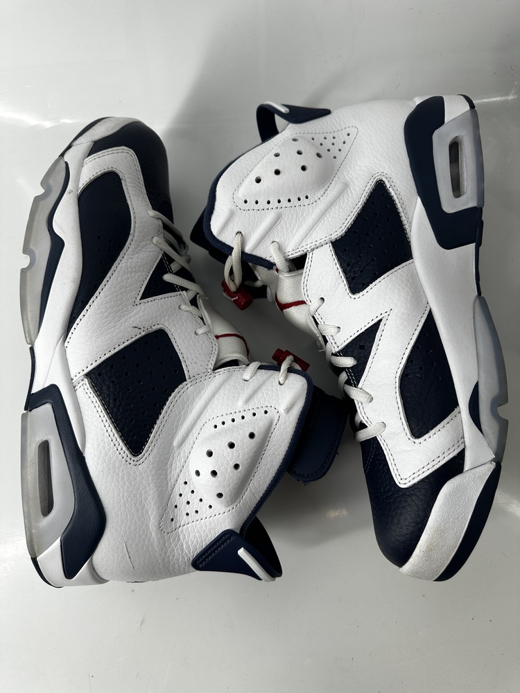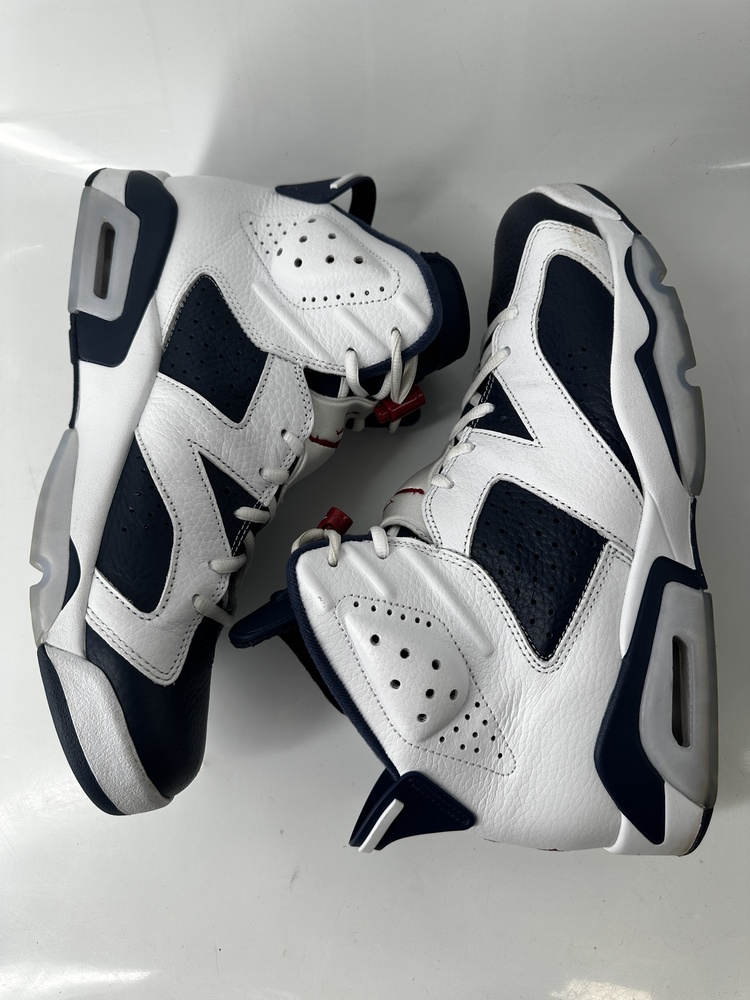 The Air Jordan 6 Retro 2024 Olympic in size 12 features a high-quality leather upper in a white and midnight navy color combination with varsity red accents that celebrate its Olympic heritage. It includes perforations for ventilation, a toggle lace-up closure for a secure fit, and a padded ankle collar for added comfort.