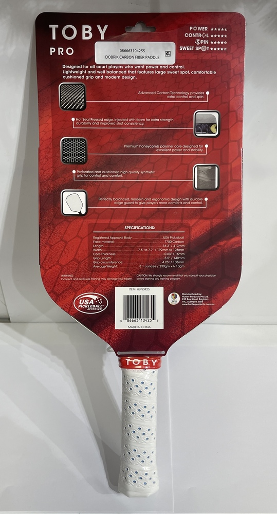 The Toby Pro Elite T700 Carbon Pickleball Paddle features a high-quality carbon fiber face and a polymer honeycomb core, delivering a perfect balance of power, control, and durability. Its lightweight design and ergonomic handle provide comfort and reduce fatigue during extended play. Engineered for precision and responsiveness, this paddle is ideal for players seeking enhanced performance in both competitive and recreational games.