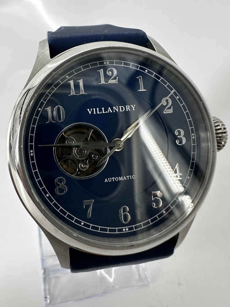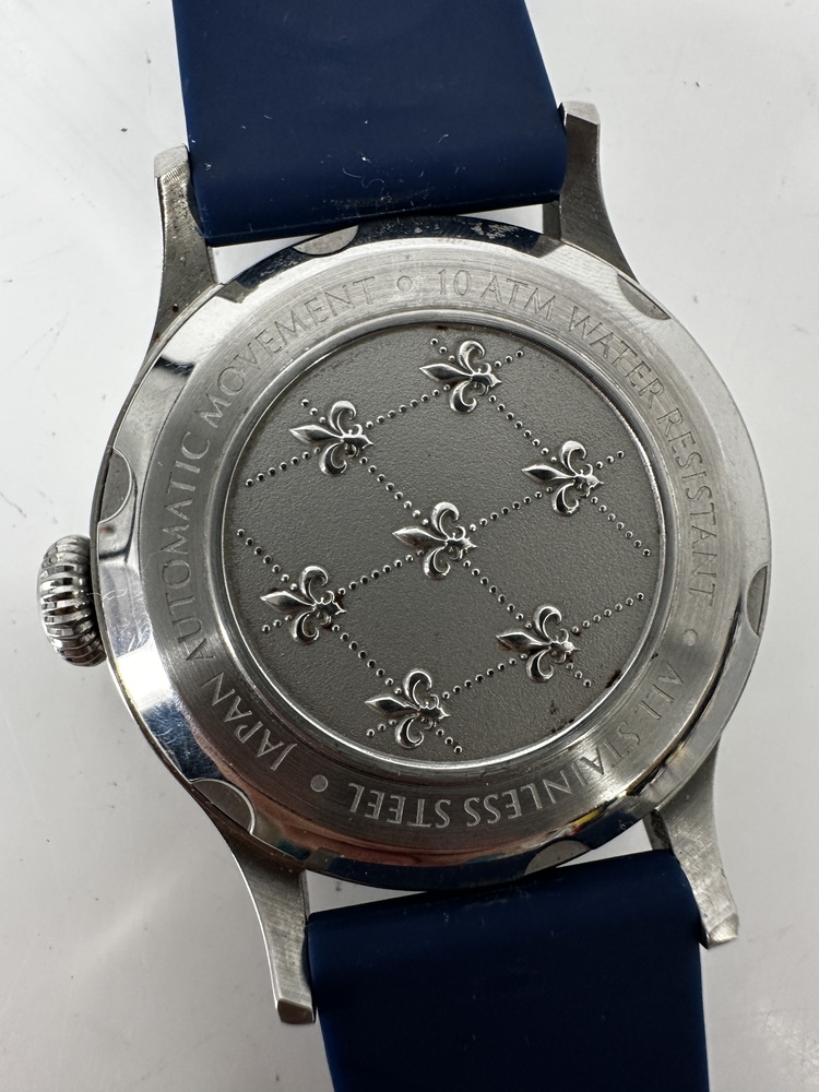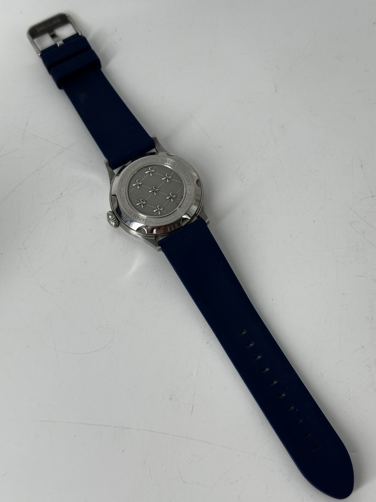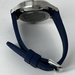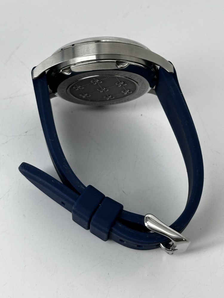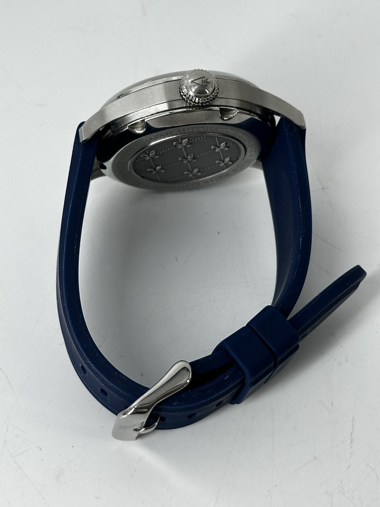 Delivering reliable self?winding timekeeping without the need for a battery. While originally sold with a black leather strap, this listing includes a replacement blue rubber band which adds sporty versatility and complements the dial color.