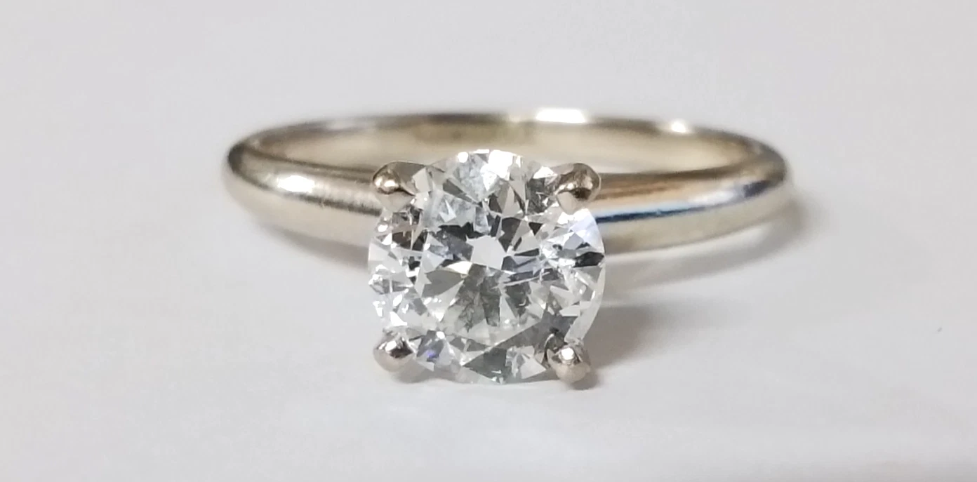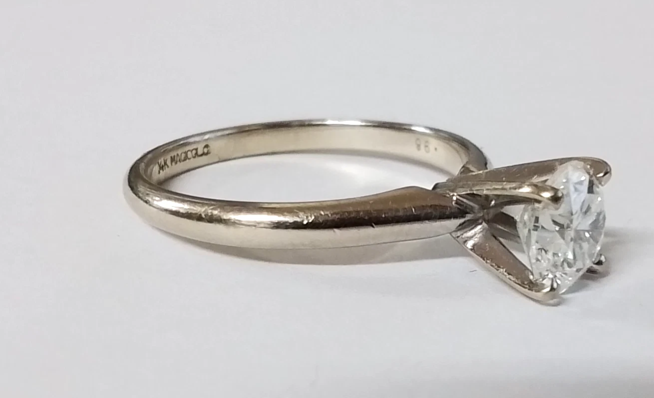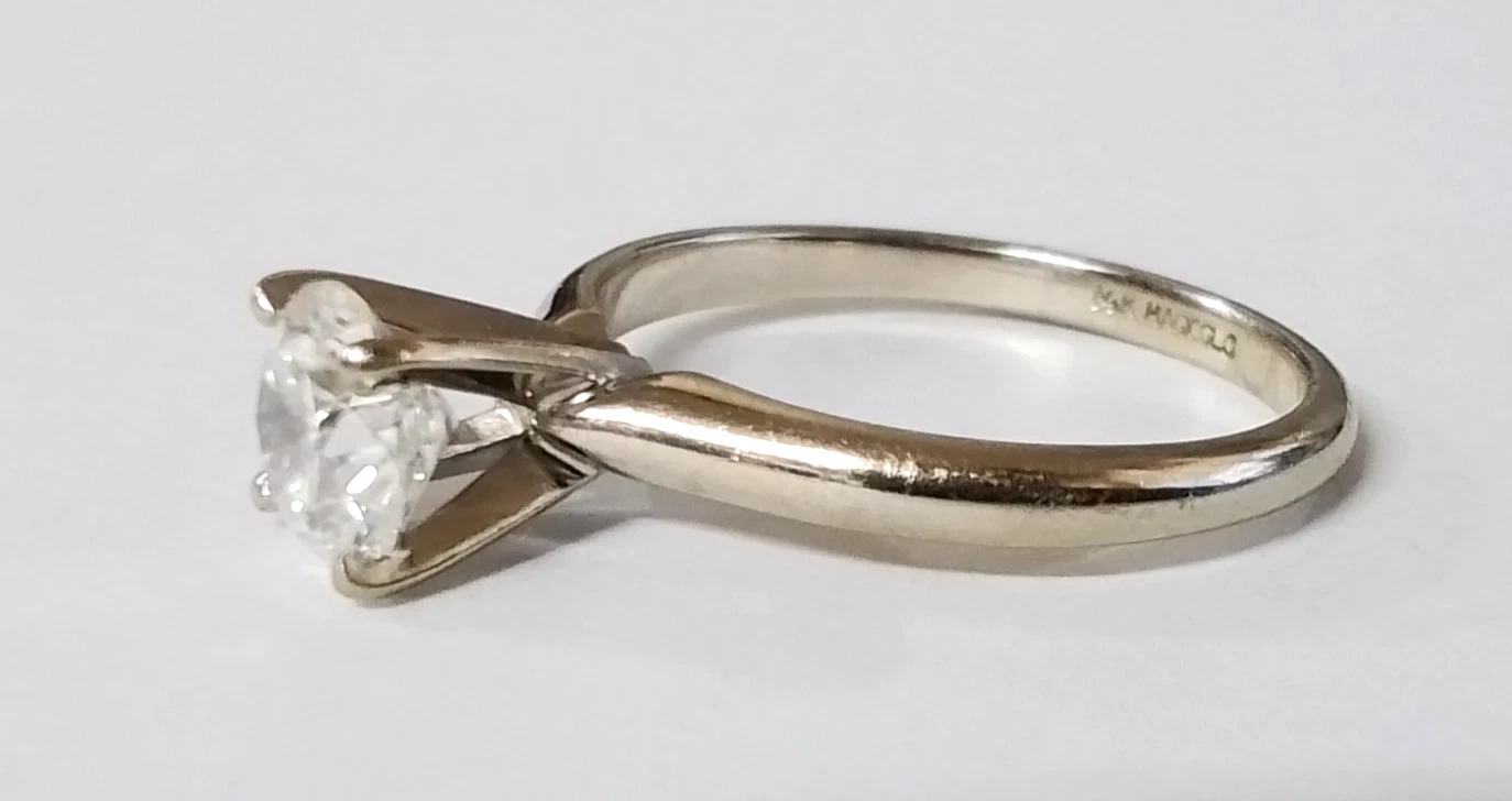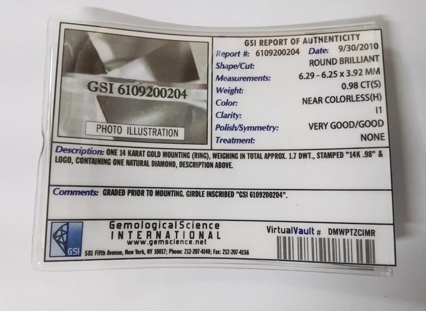 Gold 14kt 2.40gms Ring 14K WHITE GOLD BAND WITH .98CT ROUND BRILLIANT CUT DIAMOND, CLARITY I1 - COLOR H - WITH PAPERWORK Loc:Safe2 1 Round Near Colorless I1 Diamond 98.00pts. 0.980cts. 0.20g