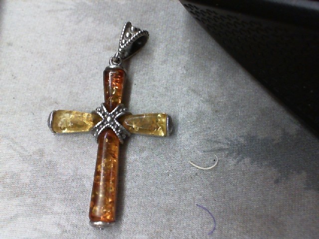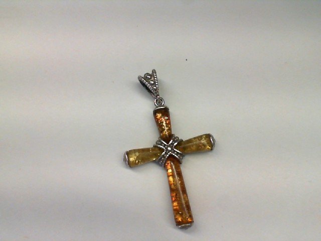 This intricately designed Sterling Silver Cross Pendant, weighing 5.20gms, boasts of a 0.925% silver content. The centerpiece is a stunning Amber gem, adding to its overall ornate appeal. Perfect for religious occasions or as a statement piece.