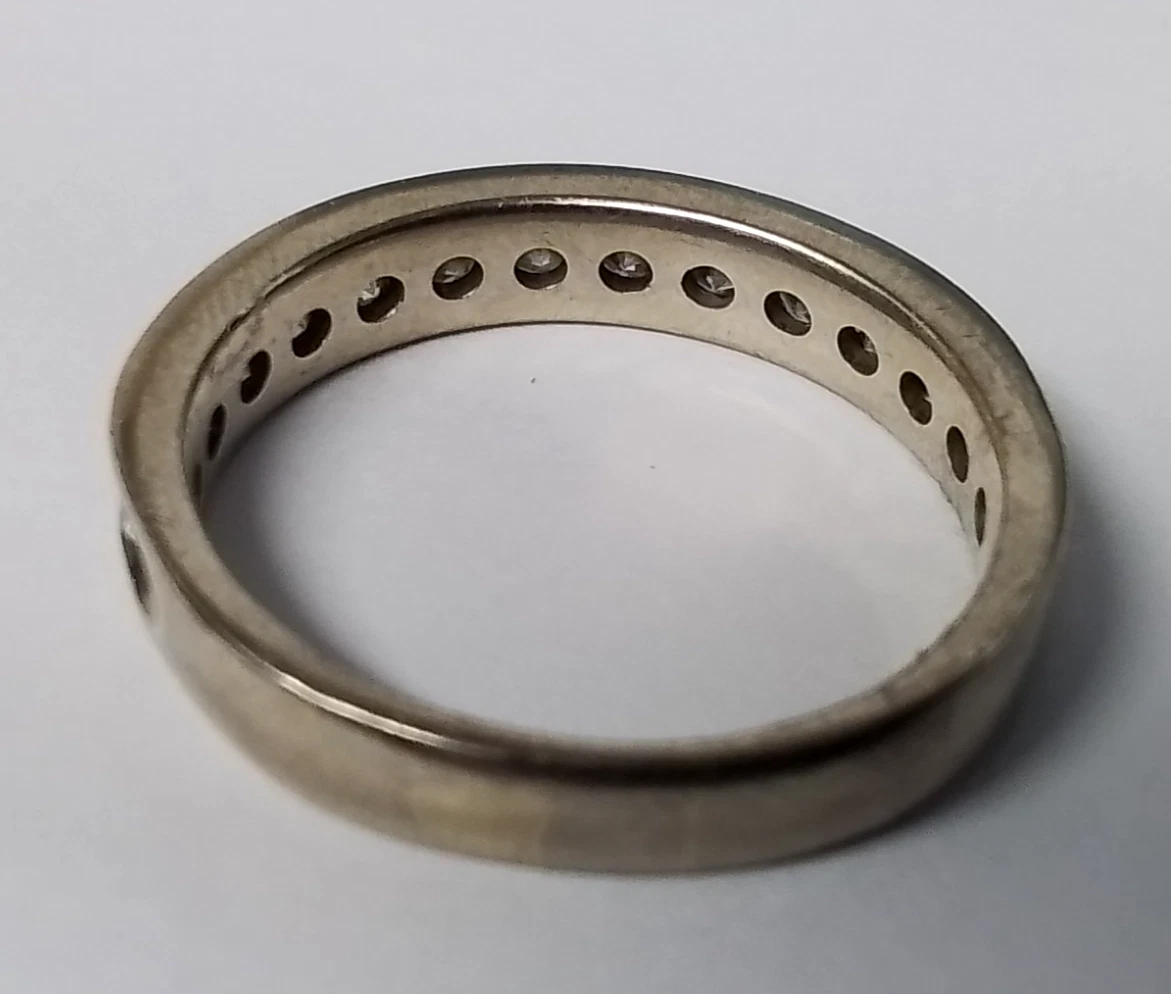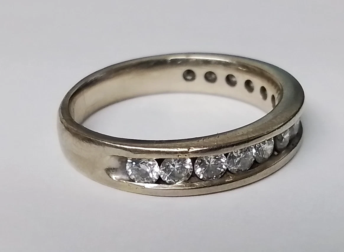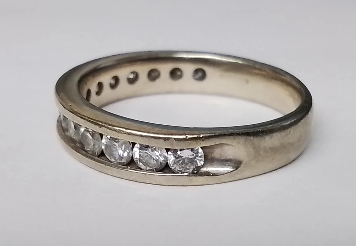 This 0.98 ctw Round Diamond Channel-Set Wedding Band Ring in 14k white Gold is a stunning piece of jewelry perfect for any bride or anniversary celebration. With 14 sparkling white diamonds set in a channel style, this ring exudes elegance and sophistication. The rich white gold metal adds a touch of warmth to the design, making it a versatile and timeless piece for any woman's jewelry collection. This ring is a beautiful symbol of love and commitment, with a classic and stylish setting that is sure to please any wearer.